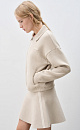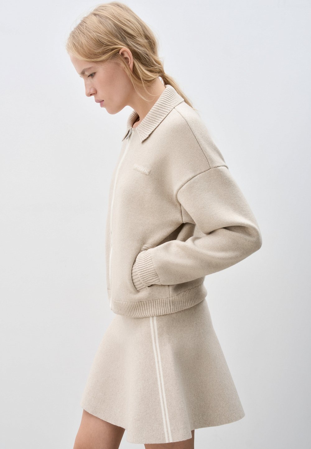 Knitted cashmere and wool bomber jacket. The model has a loose silhouette, with dropped shoulders, a turn-down collar, side pockets, a zipper closure, a contrasting color placket and a branded jacquard on the chest. The bottom of the product is made with elastic. You can complement the look with a skirt in the same style.
