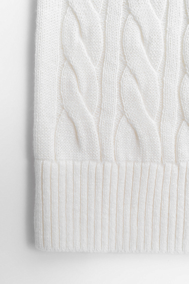 Knitted hoodie with voluminous braids made of soft wool. The model has a loose silhouette, with dropped shoulders, patch pockets and a hood. The product is decorated with branded jacquard on the back. Zip closure. Made without lining. You can complement the look with trousers or a skirt in the same style.