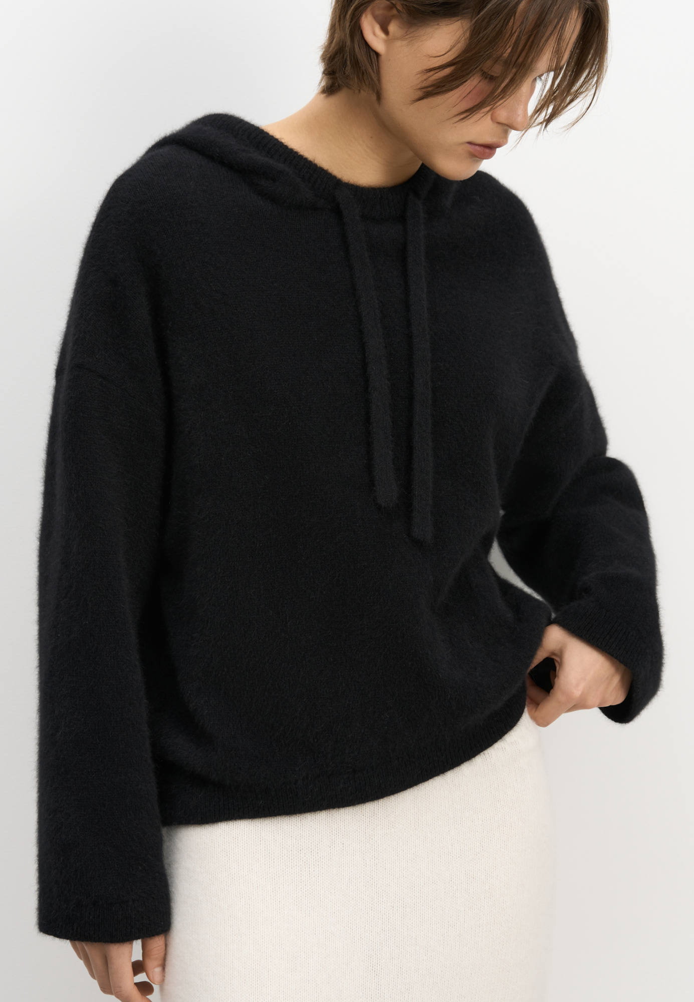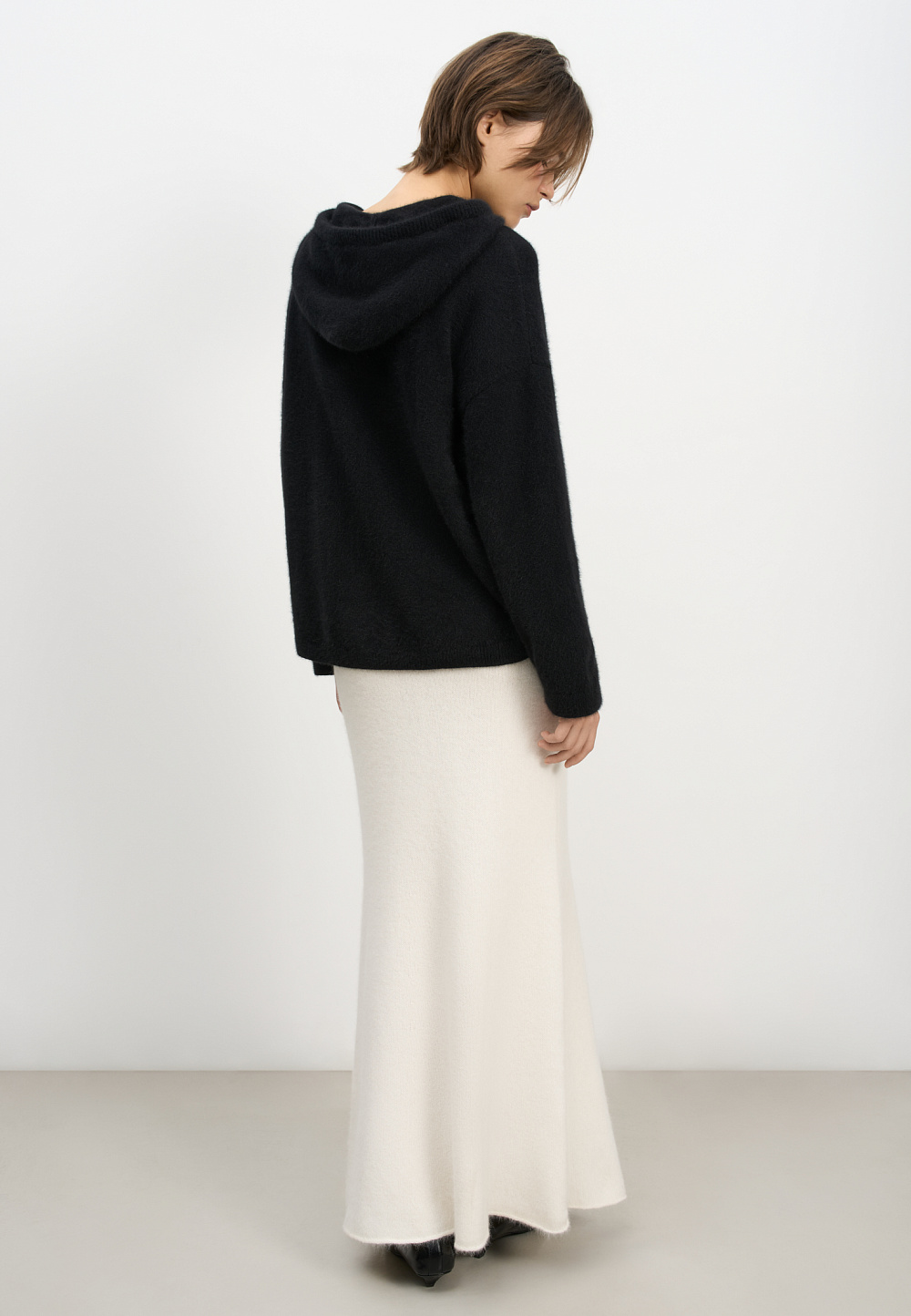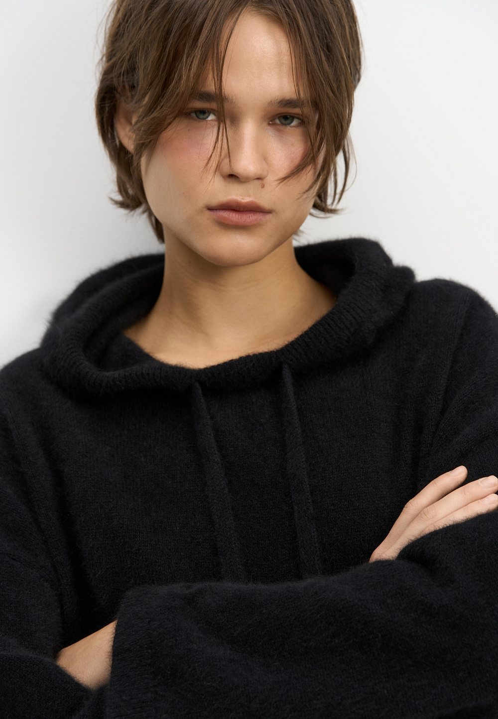 Knitted fox fur hoodie. Loose silhouette model with a hood and dropped shoulders.