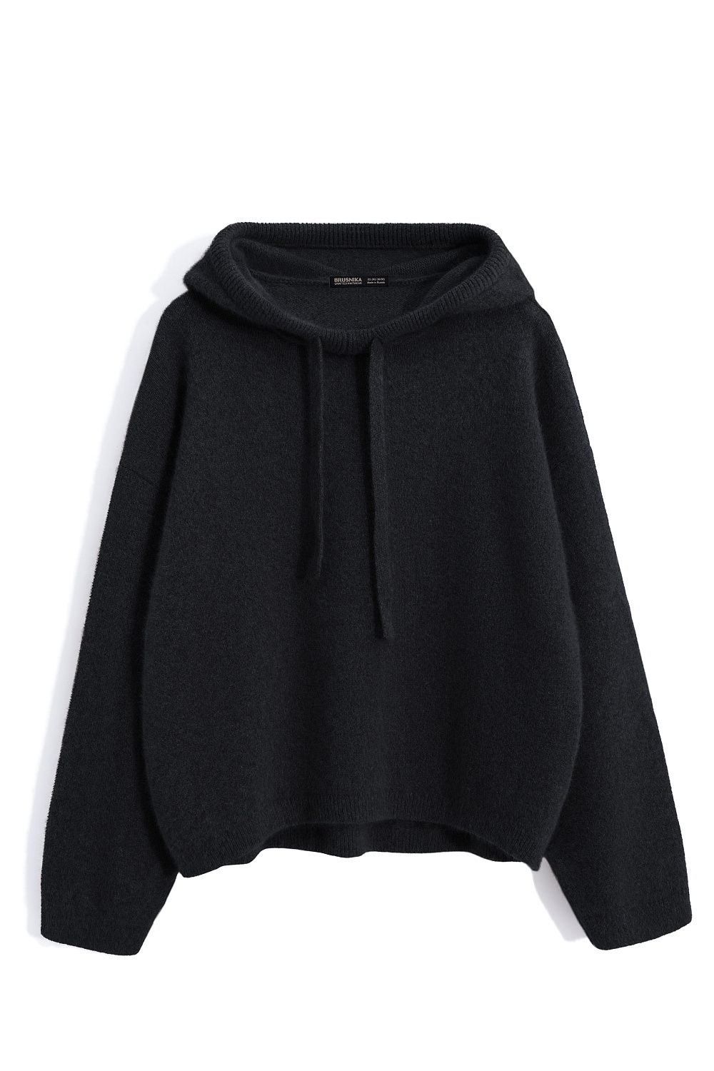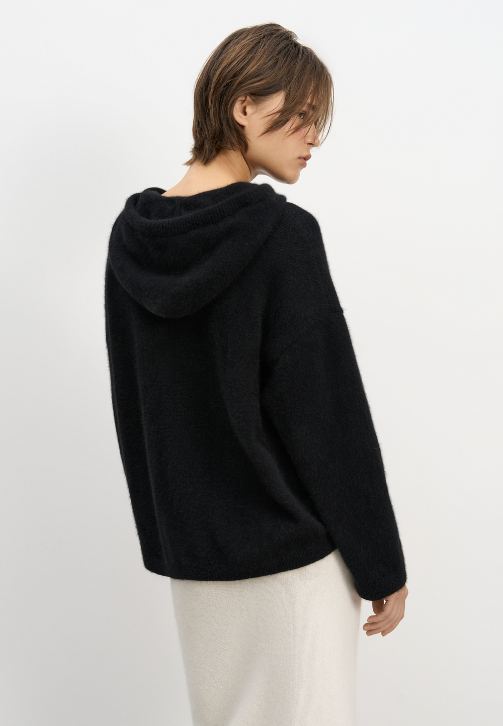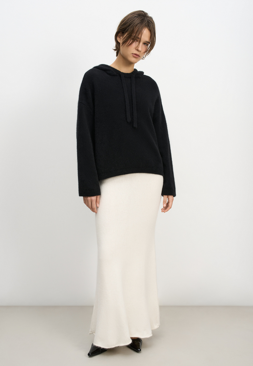 Knitted fox fur hoodie. Loose silhouette model with a hood and dropped shoulders.