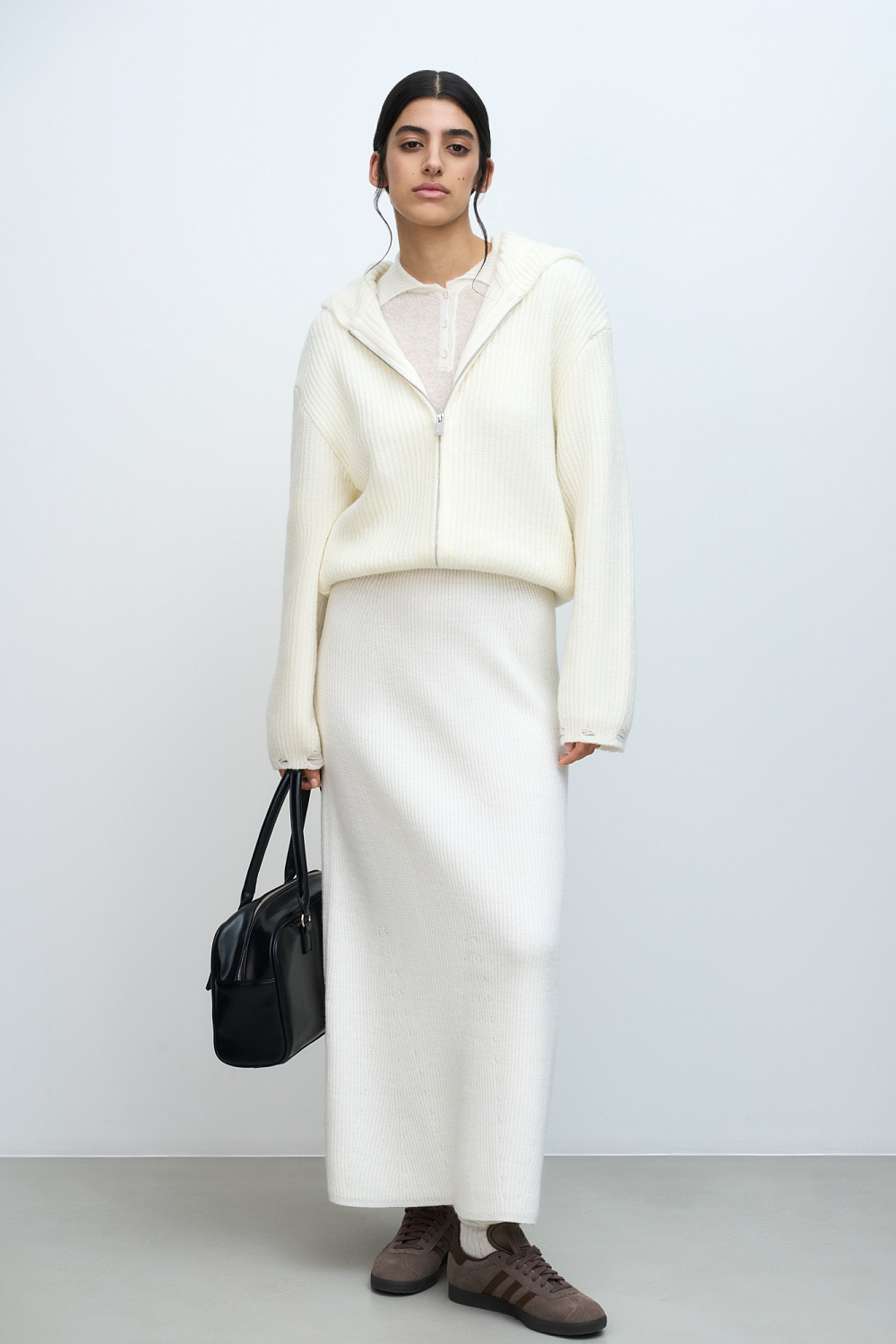 Merino wool bomber jacket with hood. Loose silhouette model with slits in grunge style.