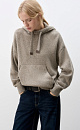 Silk-blend knitted hoodie. The model has a loose silhouette, with dropped shoulders, long sleeves, a wide hood with a drawstring and a kangaroo pocket. The edges of the product are made with a wide rib.