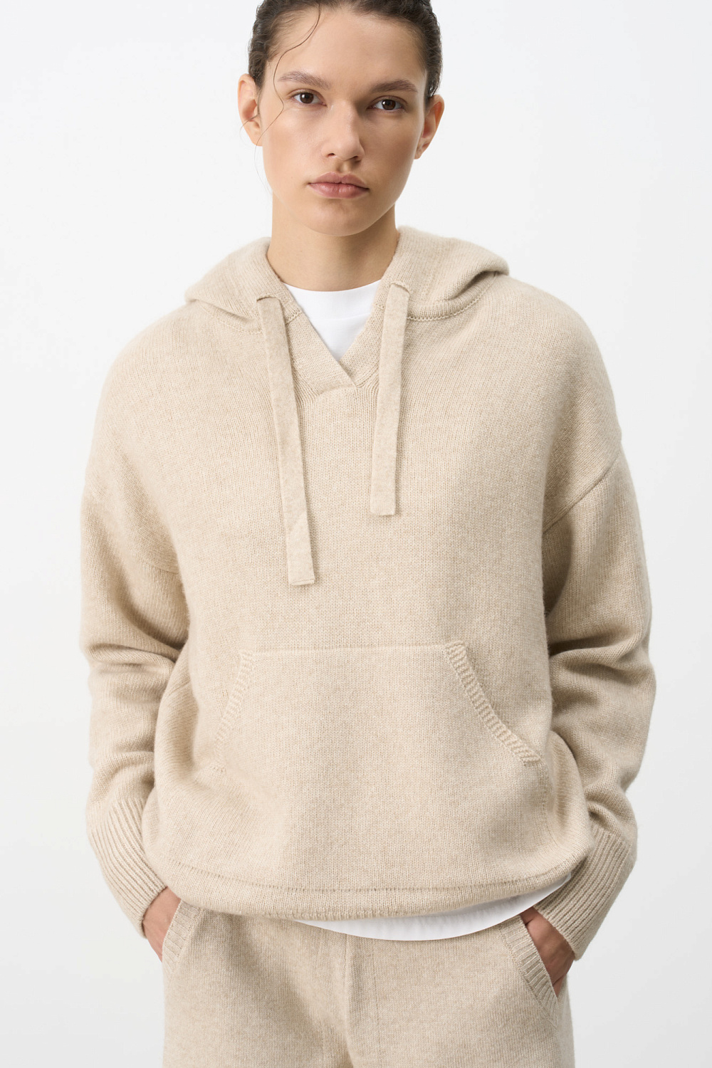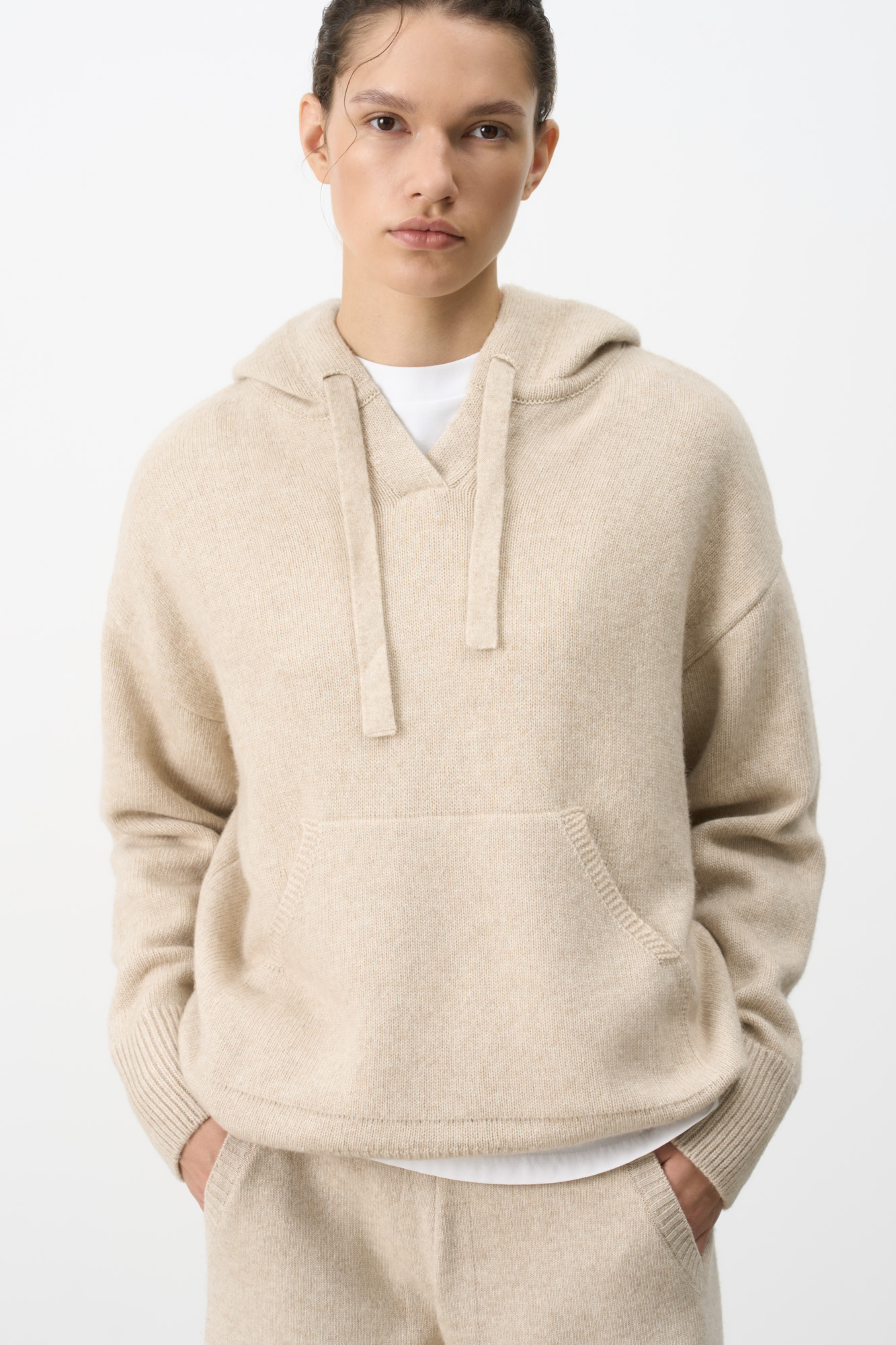 Cashmere and wool hooded jumper with kangaroo pocket. Pairs perfectly with matching trousers for a cozy fall/winter look.