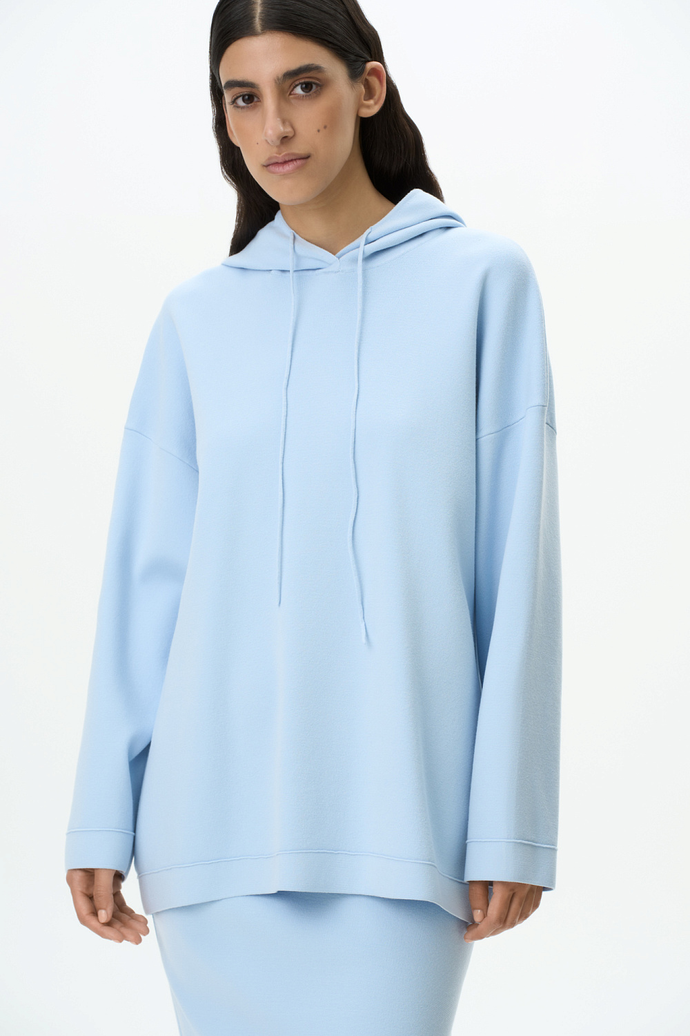 Knit viscose jumper with a drawstring hood and dropped shoulders.