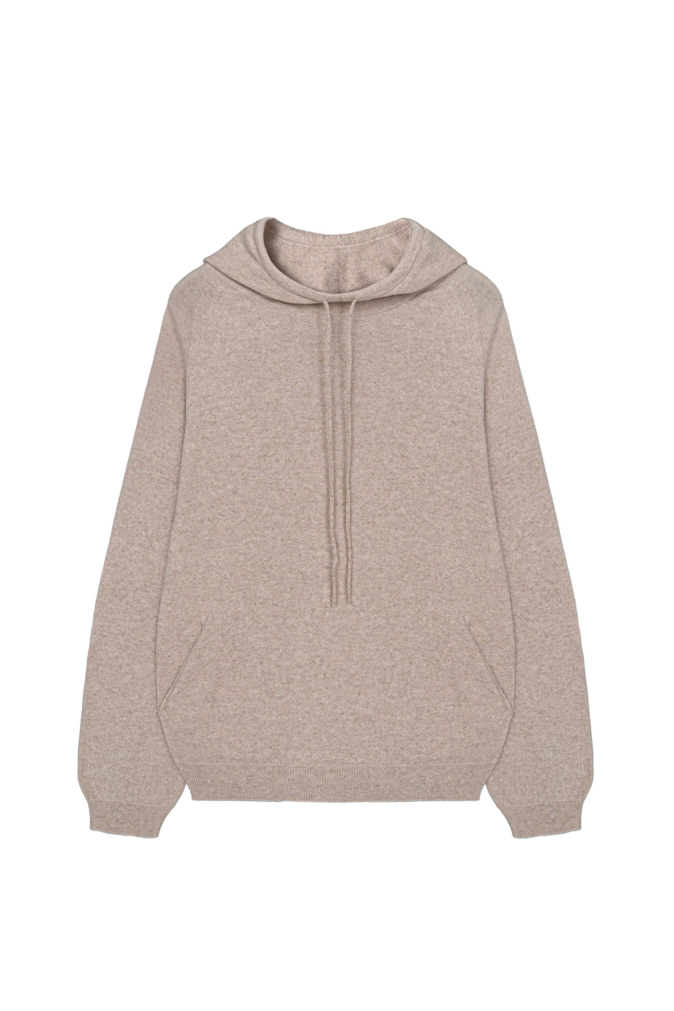 Dropped shoulders knit wool blend jumper. Relaxed silhouette with side pockets and a hood with a drawstring.