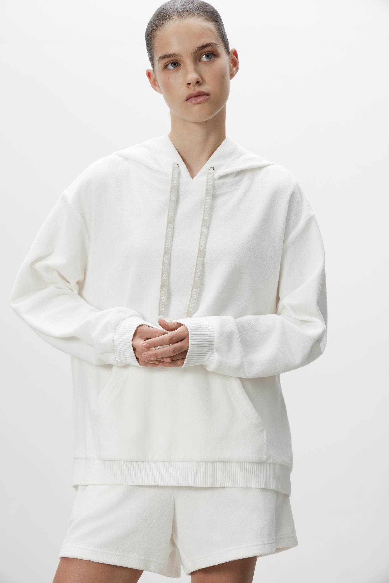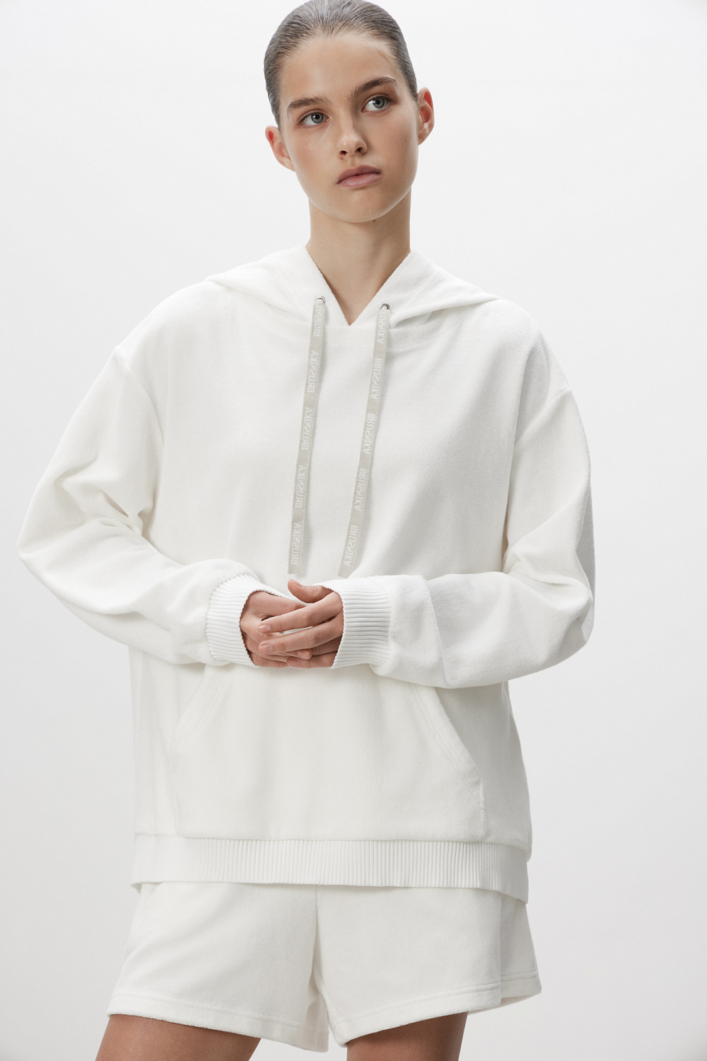 Terry jersey hoodie. Loose silhouette model with dropped shoulder line. Hood with branded knitted cord and patch kangaroo pocket. The cuff and bottom of the product are finished with rib. You can complement the look with trousers in the same style.
