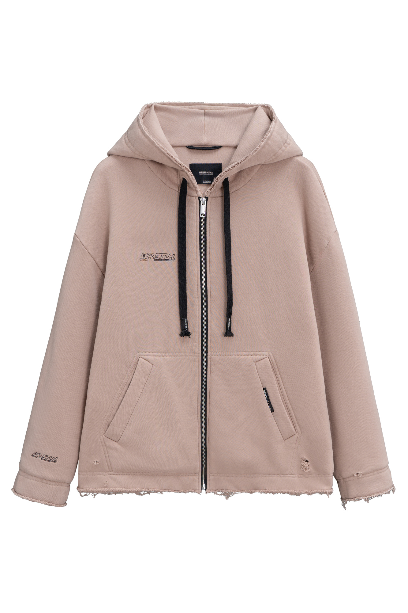 A cotton hoodie featuring a drawstring hood. Cut for a relaxed, straight silhouette with dropped shoulders and long sleeves, it also includes patch pockets. Embroidered detailing accents the chest and cuffs. The raw, unfinished edges on the hem and cuffs add a touch of effortless cool. A zipper closure completes the design.