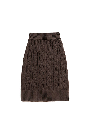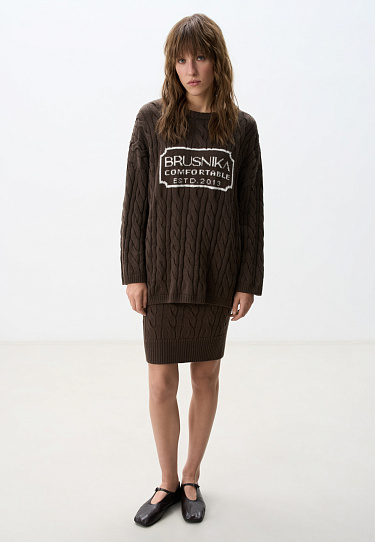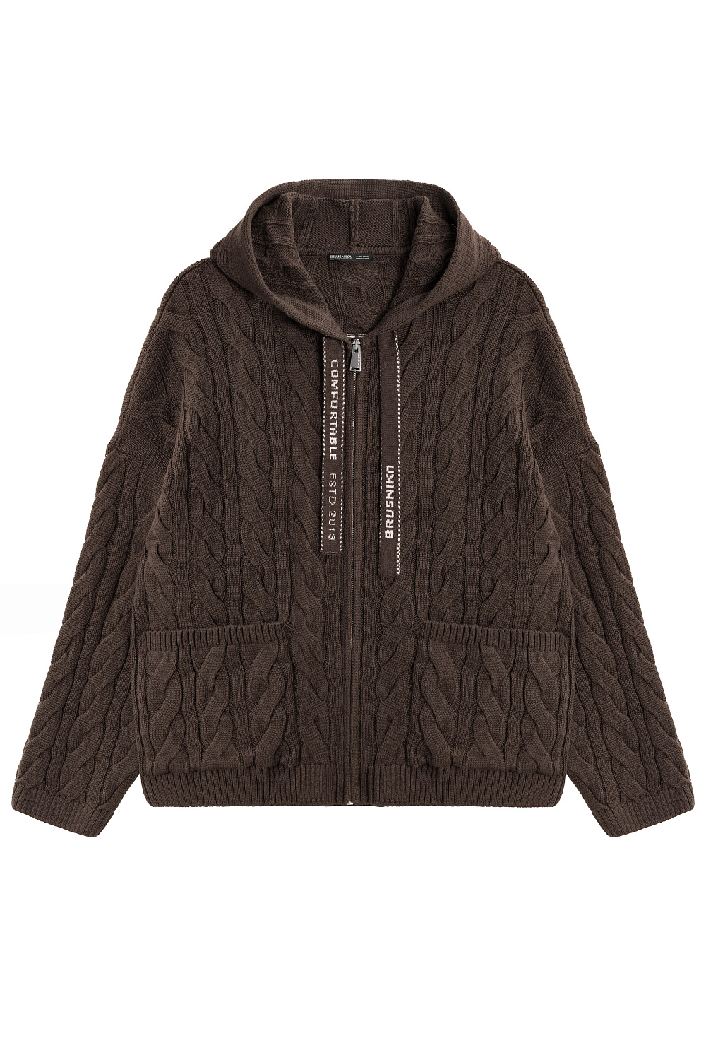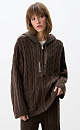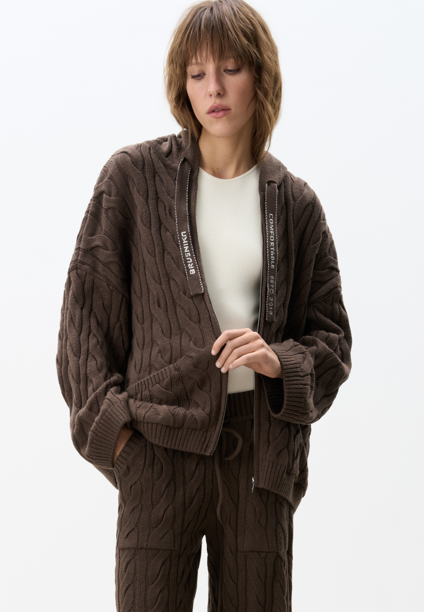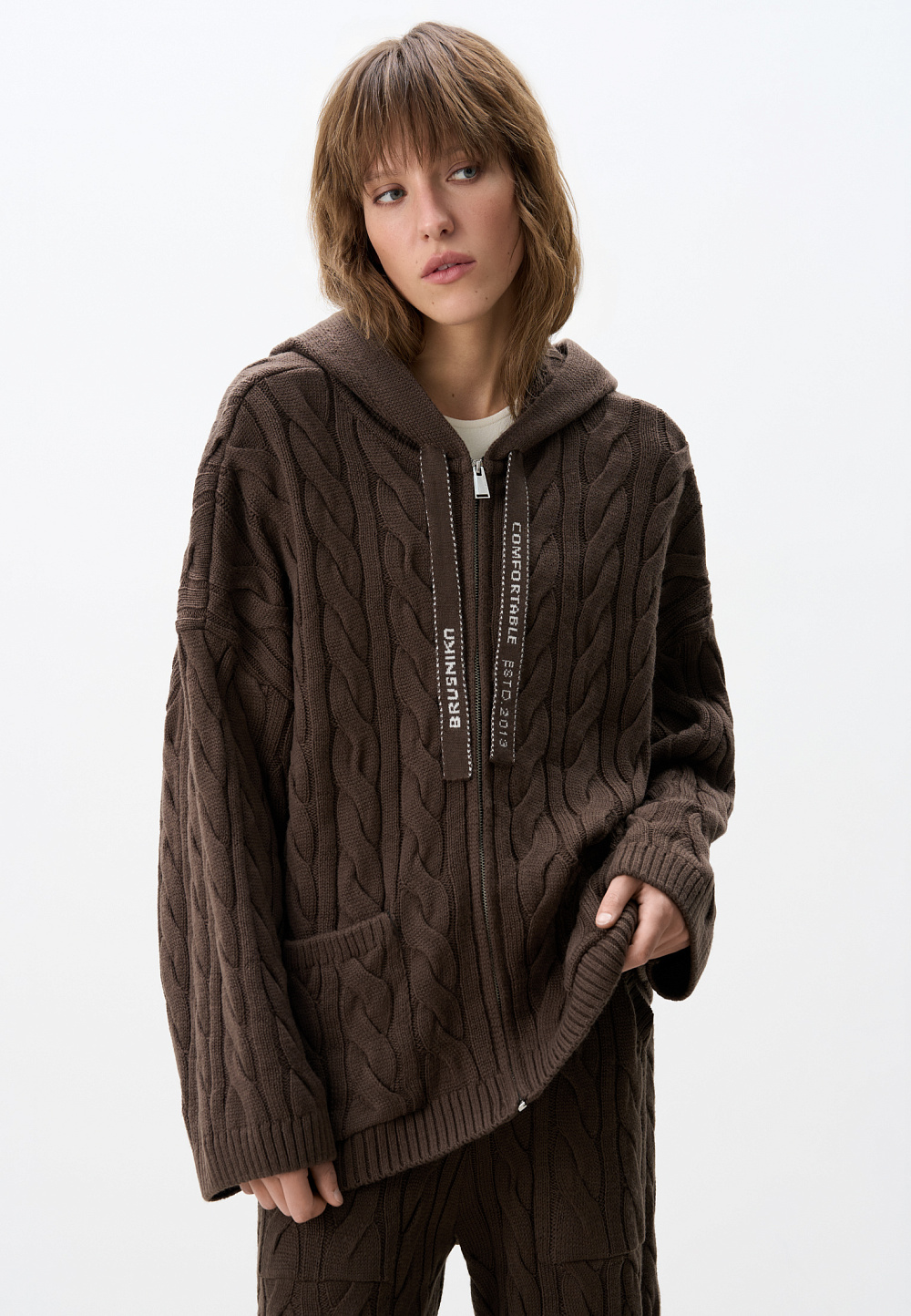 Knitted hoodie with voluminous braids made of soft wool. The model has a loose silhouette, with dropped shoulders, patch pockets and a hood. The product is decorated with branded jacquard on the back. Zip closure. Made without lining. You can complement the look with trousers or a skirt in the same style.