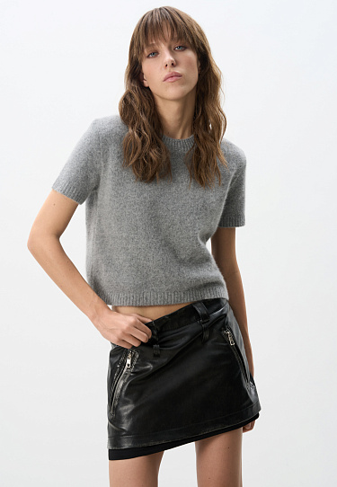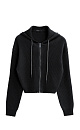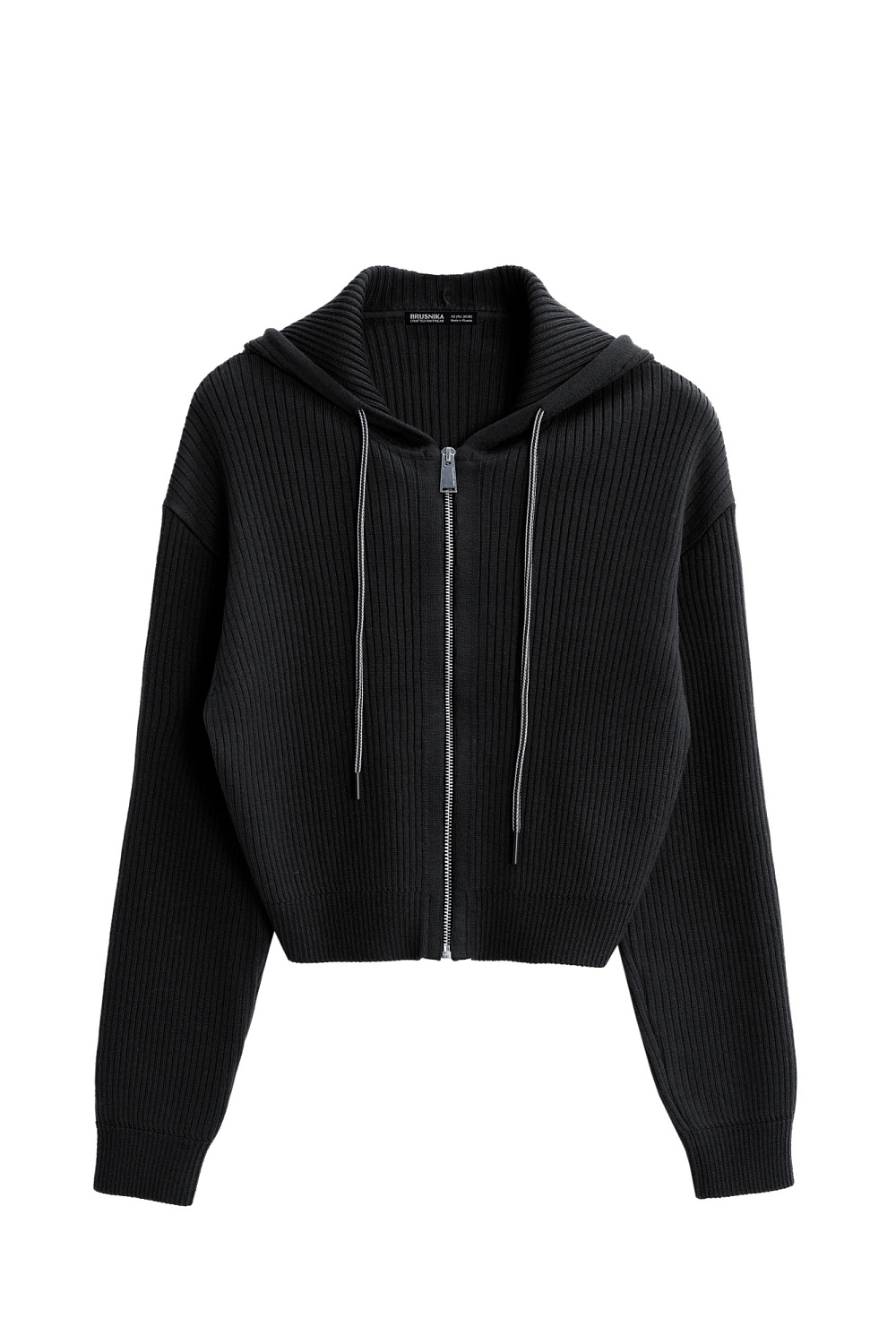 Short knitted wool bomber jacket. The model has a loose silhouette, with dropped shoulders, long sleeves and a hood with a drawstring. The bottom of the product and the cuffs of the sleeves are made with elastic elastic. Zip closure.