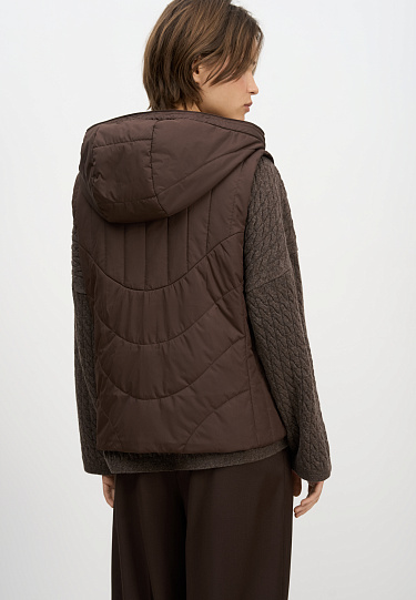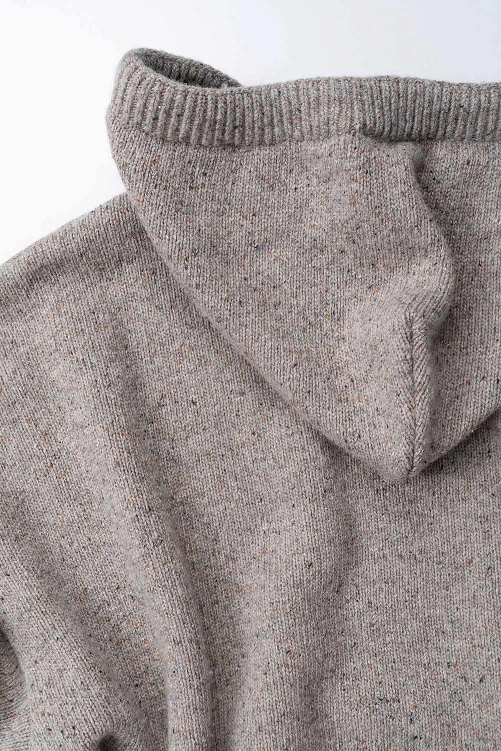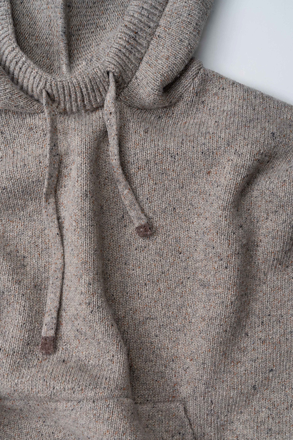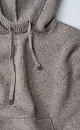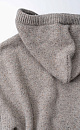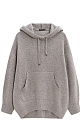 Silk-blend knitted hoodie. The model has a loose silhouette, with dropped shoulders, long sleeves, a wide hood with a drawstring and a kangaroo pocket. The edges of the product are made with a wide rib.
