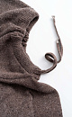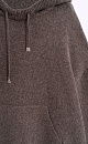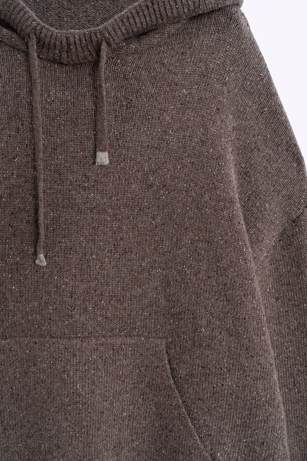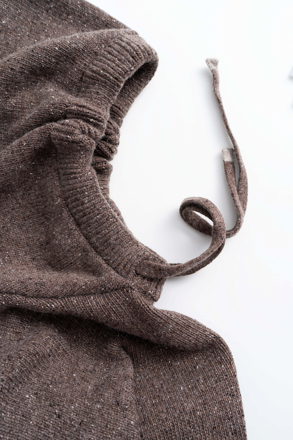 Silk-blend knitted hoodie. The model has a loose silhouette, with dropped shoulders, long sleeves, a wide hood with a drawstring and a kangaroo pocket. The edges of the product are made with a wide rib.