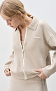 Knitted cashmere and wool bomber jacket. The model has a loose silhouette, with dropped shoulders, a turn-down collar, side pockets, a zipper closure, a contrasting color placket and a branded jacquard on the chest. The bottom of the product is made with elastic. You can complement the look with a skirt in the same style.