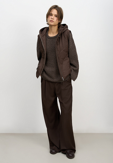 Silk-blend knitted hoodie. The model has a loose silhouette, with dropped shoulders, long sleeves, a wide hood with a drawstring and a kangaroo pocket. The edges of the product are made with a wide rib.