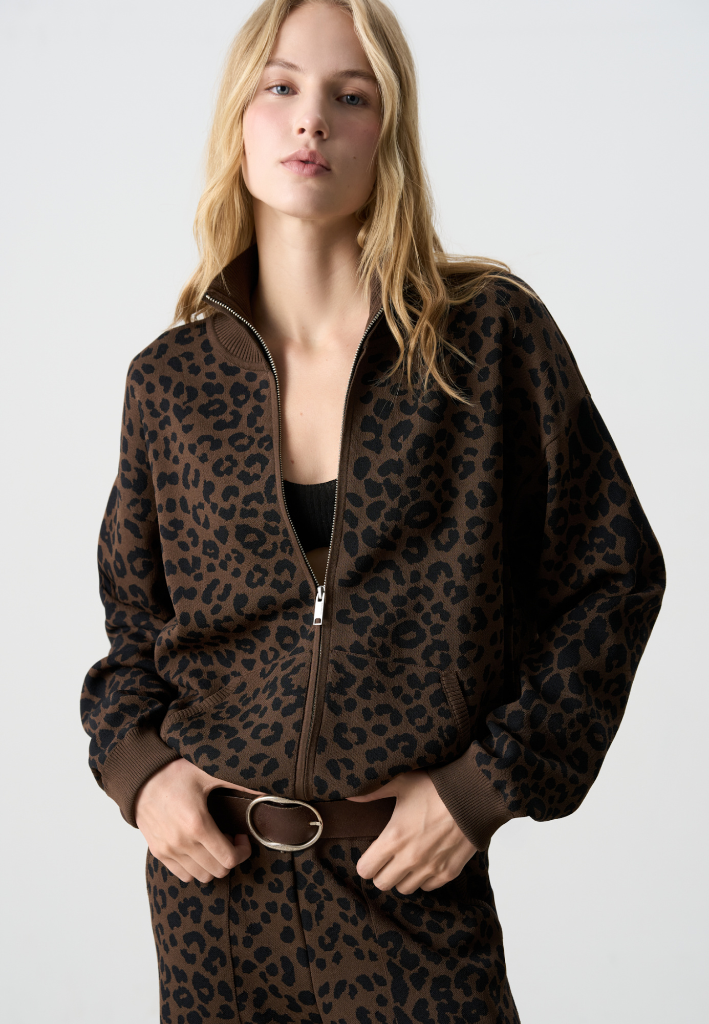 Knitted viscose bomber jacket with animal print imitating leopard spots. The model has a loose fit, with dropped shoulders, a stand-up collar and two side pockets. Zip closure. The edges of the product are ribbed.