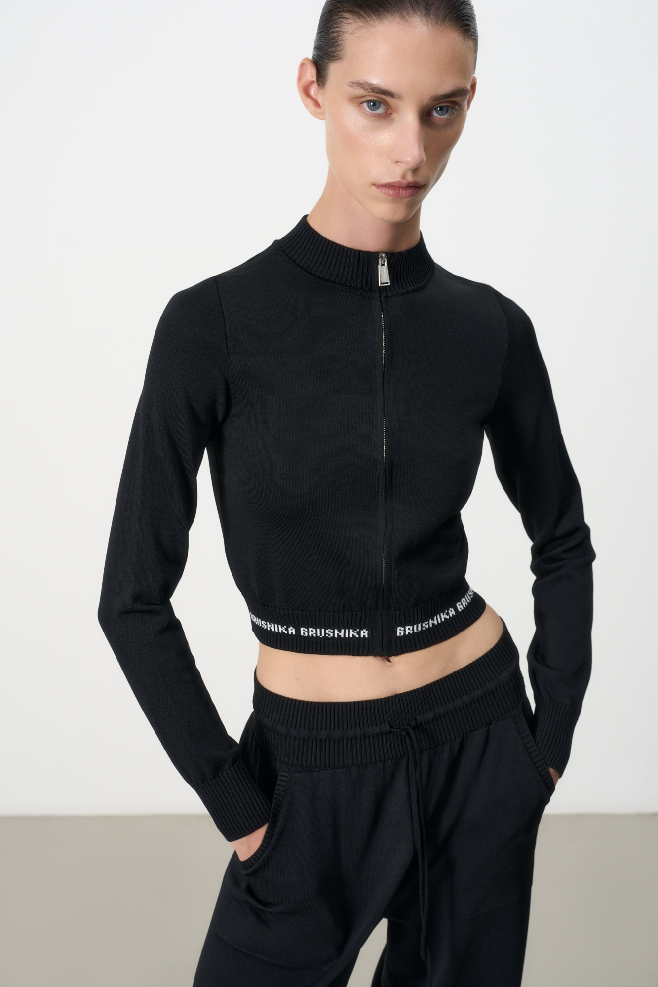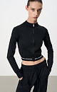 Cropped viscose bomber jacket with long sleeves. Front zip closure.