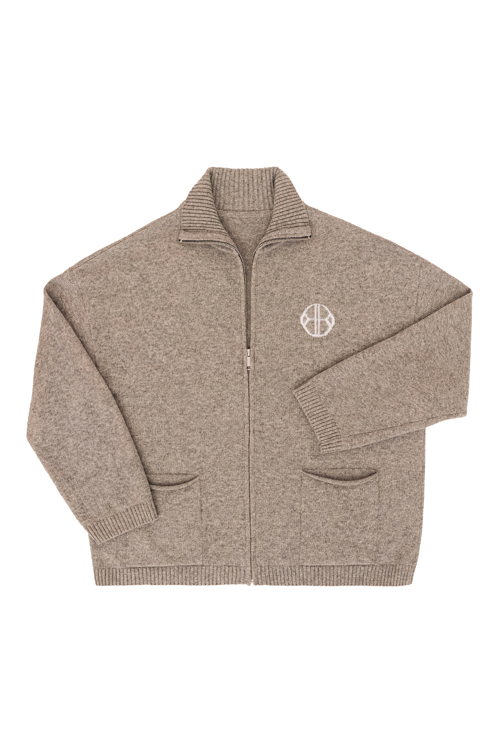 Knitted bomber jacket in a sporty style. Loose silhouette model with dropped shoulders and side pockets. Embroidered brand logo on the chest. Zip closure.