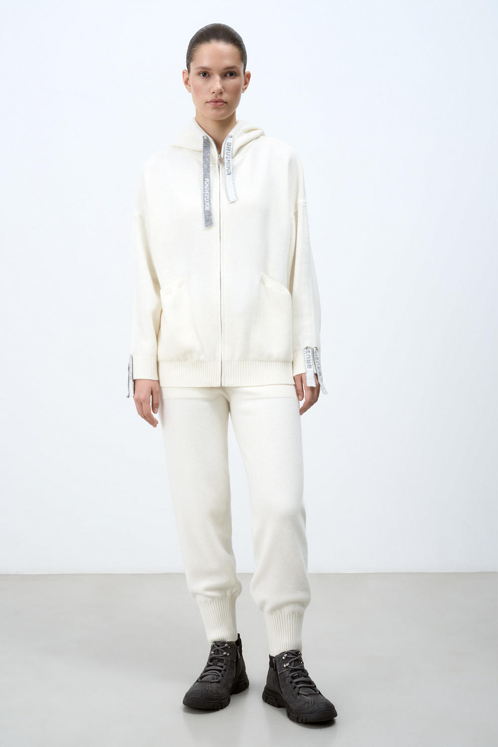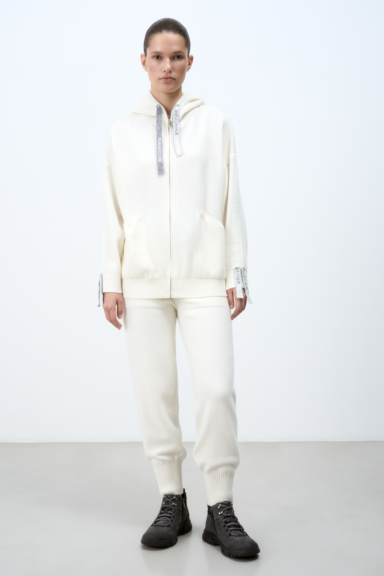 Mid-rise trousers in cashmere and wool. Elasticated waistband with branded ribbon drawstring. Two side pockets.