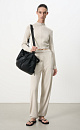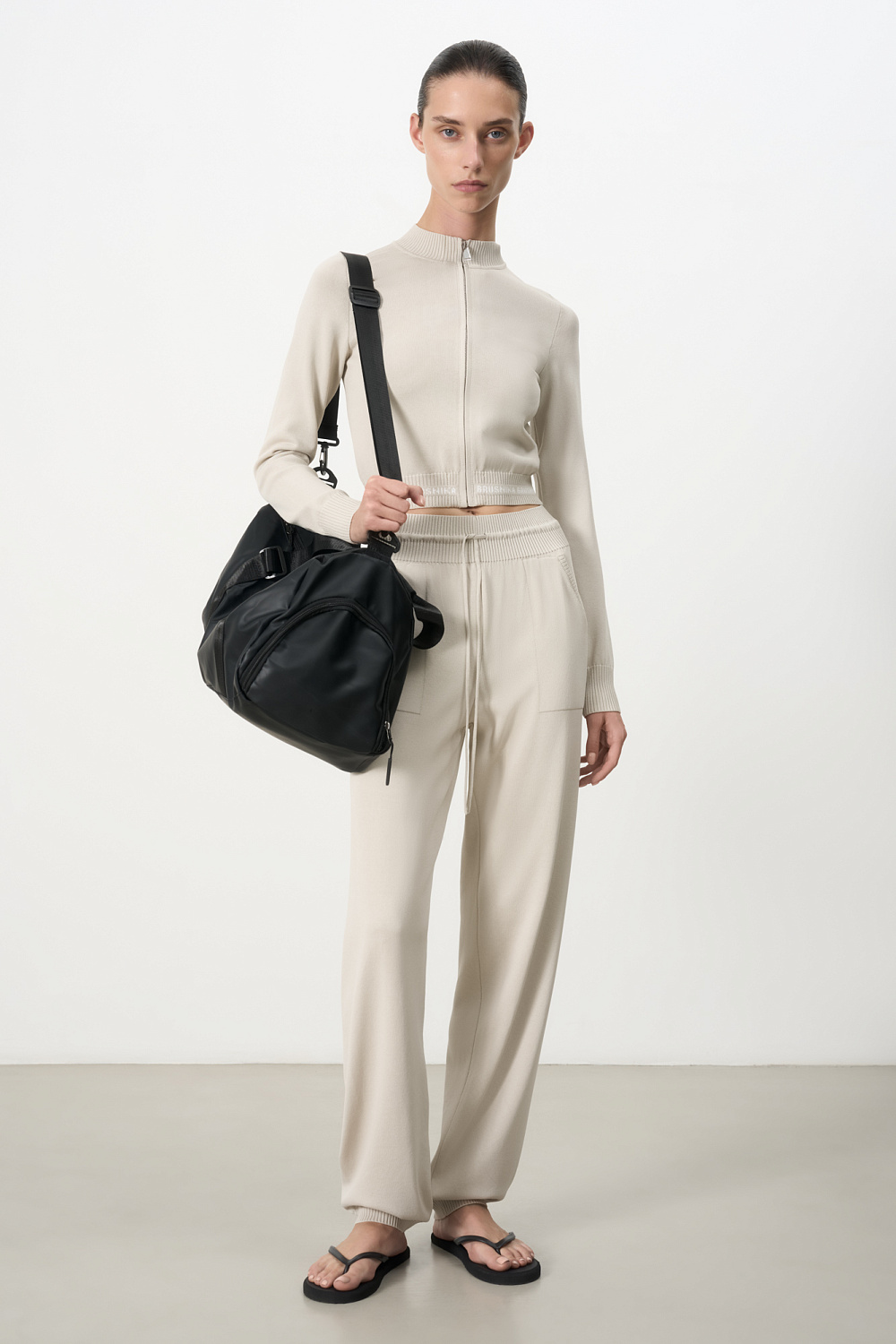 Knitted viscose trousers with side pockets. Elastic waistband with drawstring and ribbed cuffs.