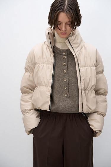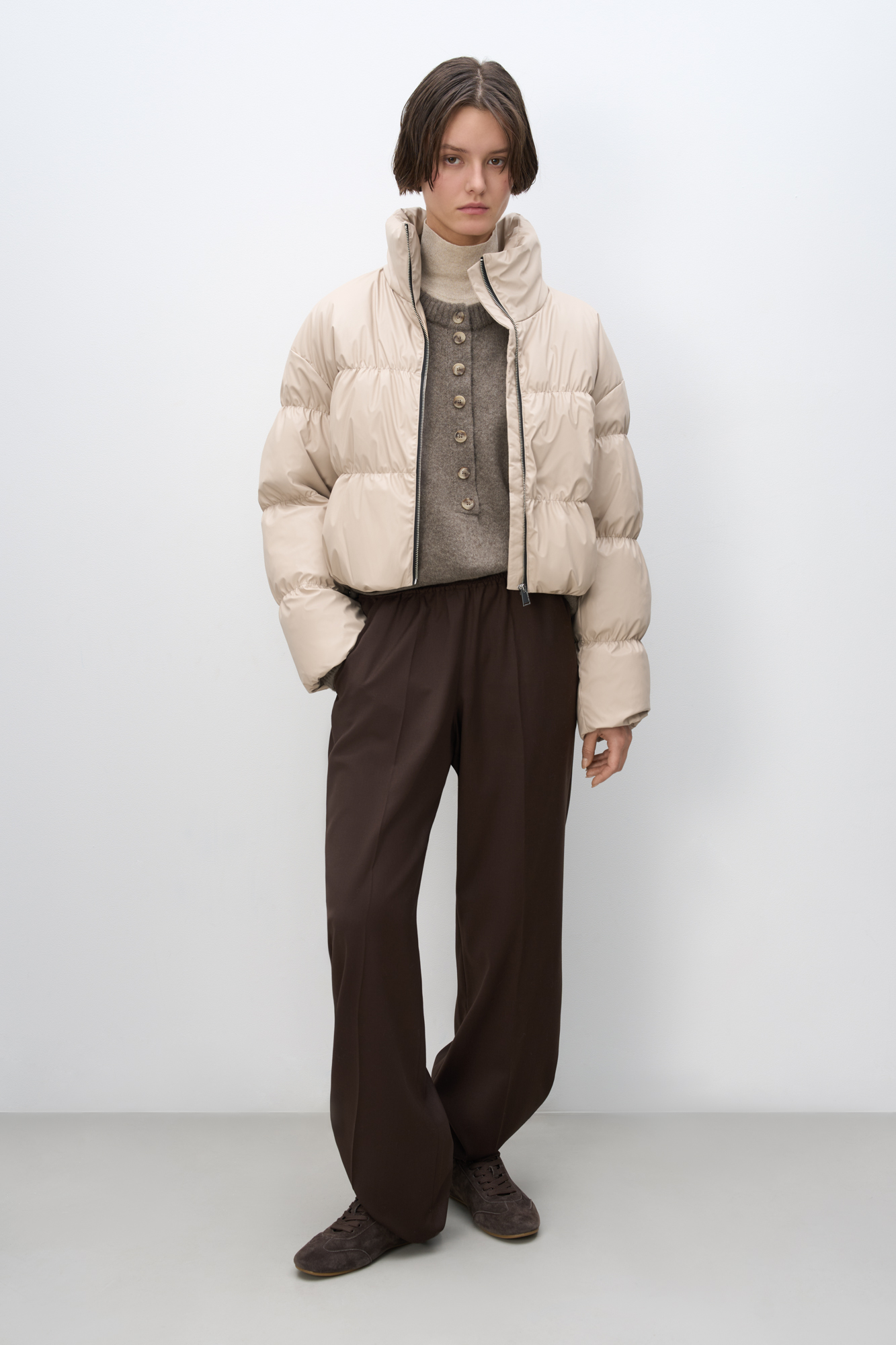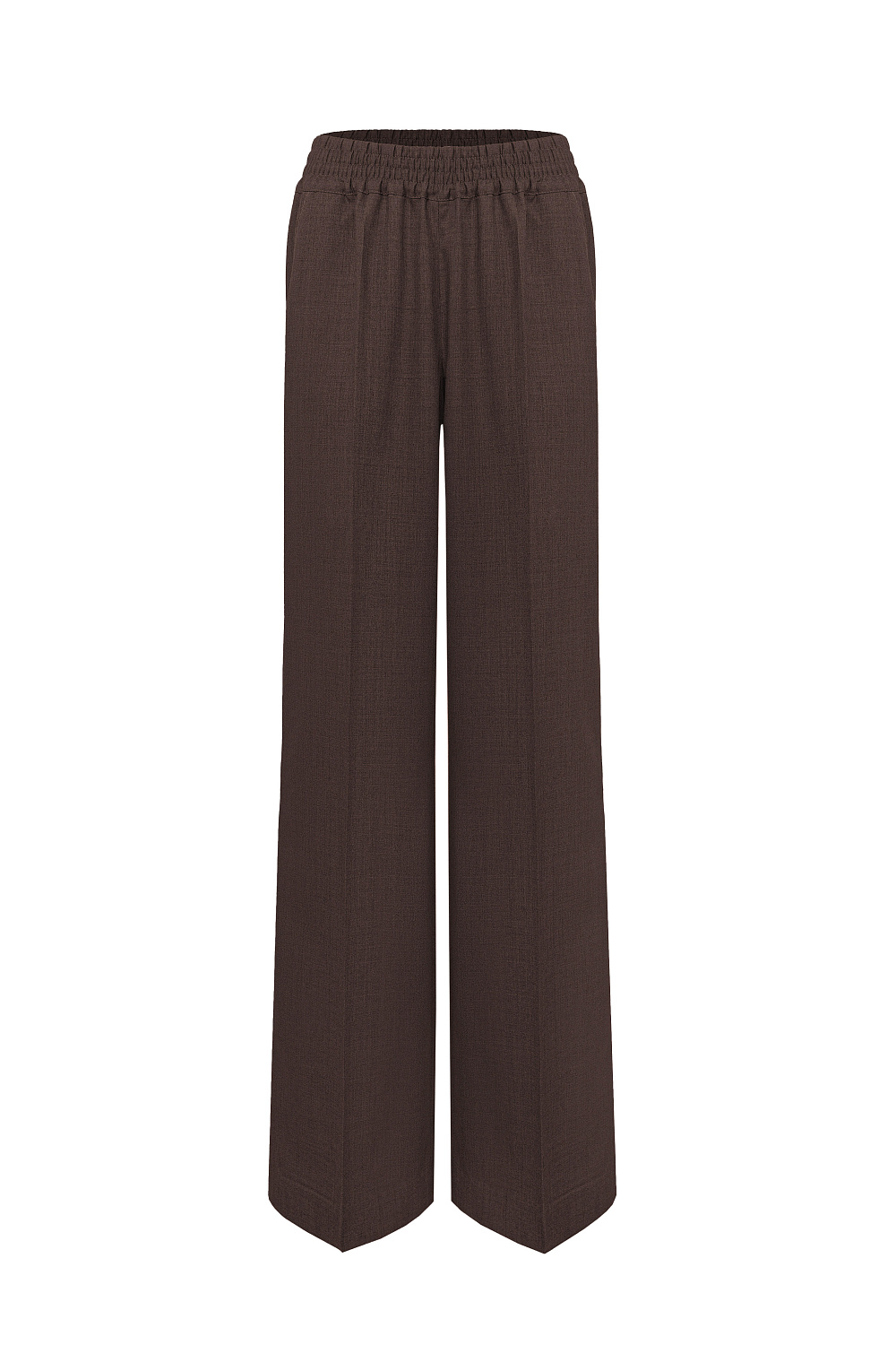 Wide loose-fit wool-blend trousers with creases. Front side pockets and elastic waistband.