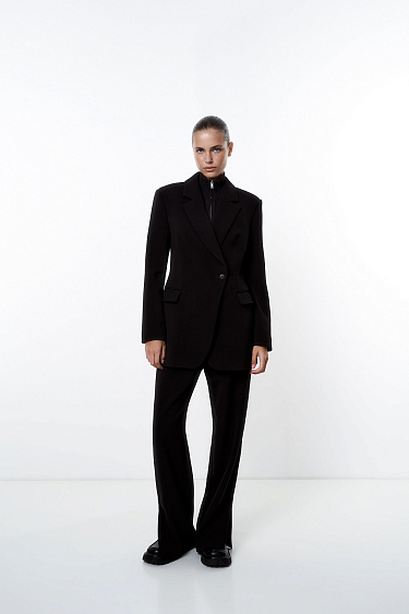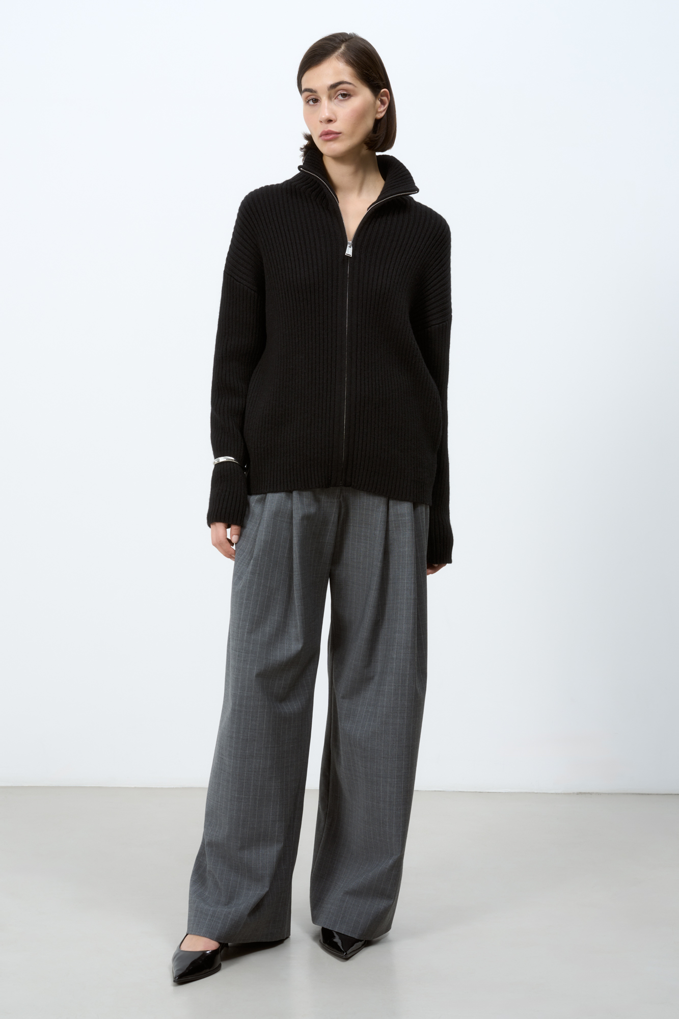 Knitted cardigan with a high stand-up collar, long sleeves and zip closure. For production, fine wool was used with the addition of delicate cashmere.