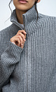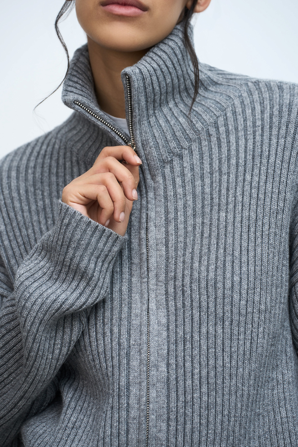 Knitted cardigan with a high stand-up collar, long sleeves and zip closure. For production, fine wool was used with the addition of delicate cashmere.