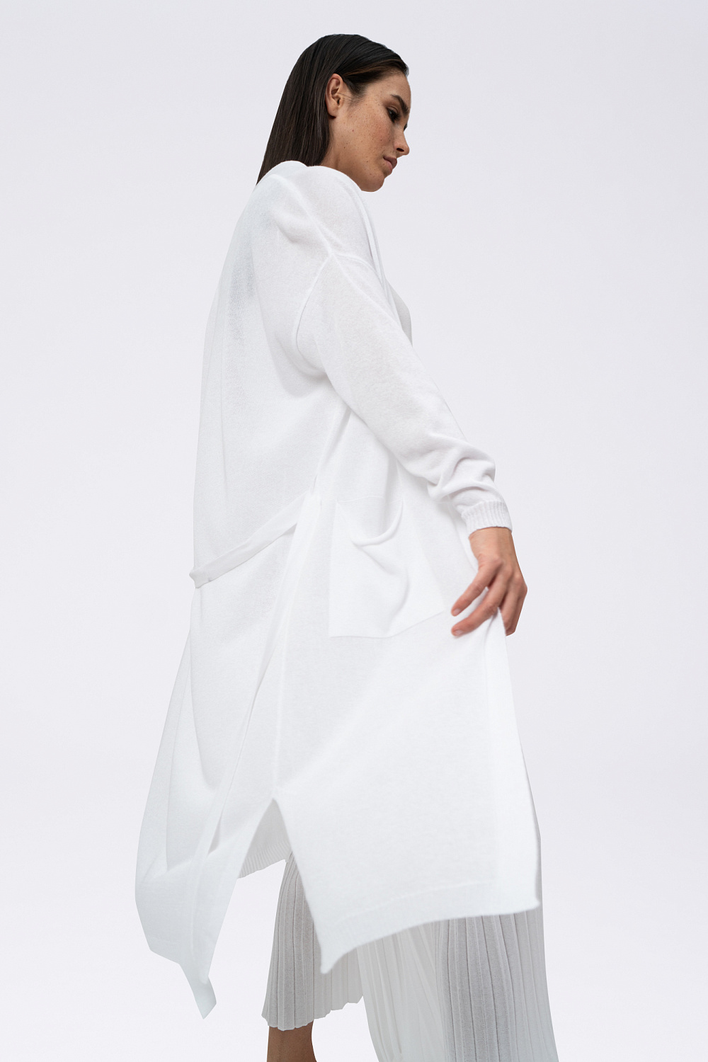Lightweight long viscose cardigan with long sleeves, patch pockets and tie belt.