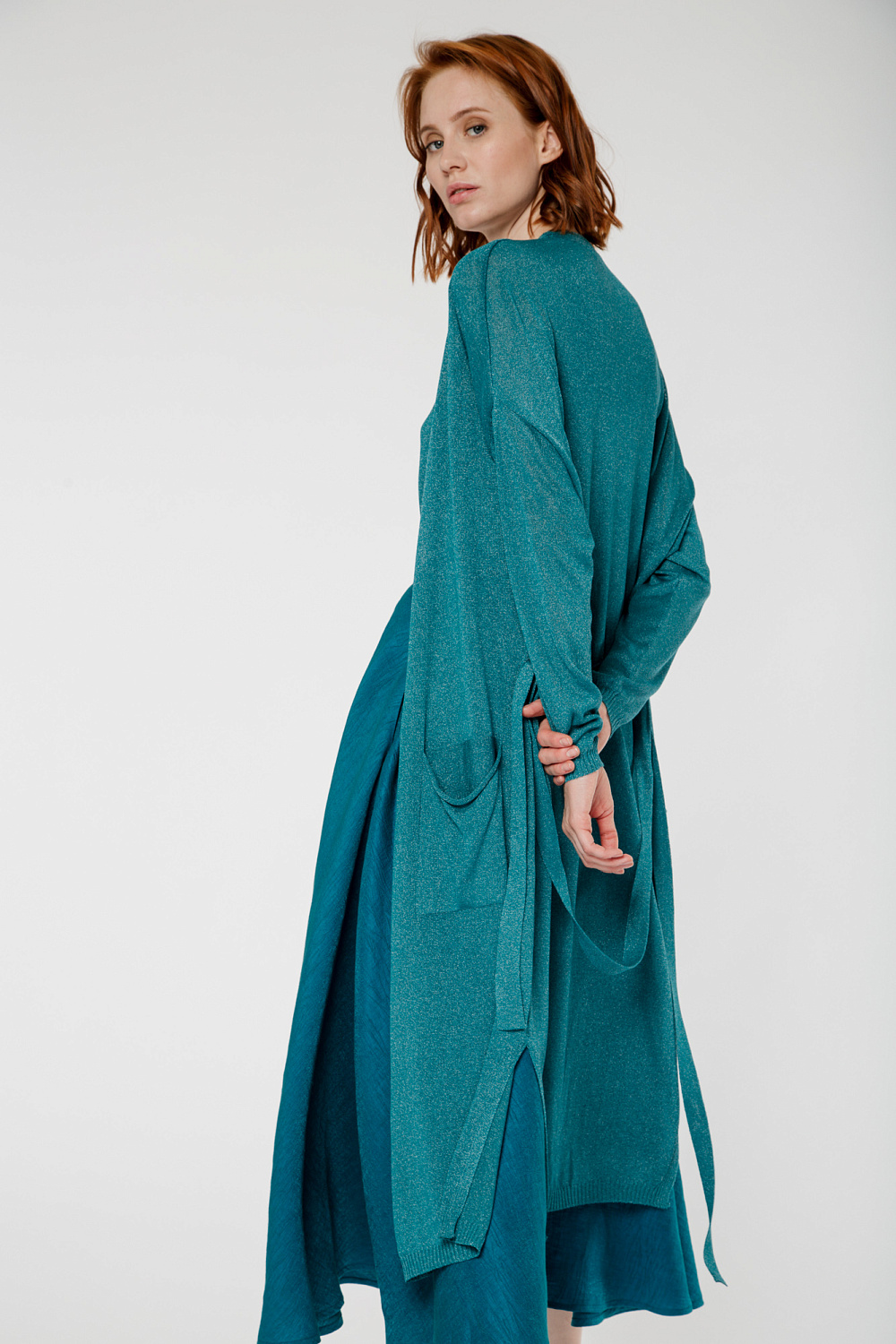 Lightweight long viscose cardigan with long sleeves, patch pockets and tie belt.
