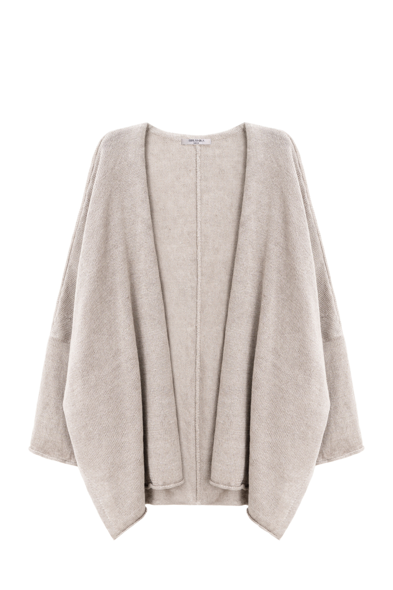 Knitted cardigan made of 100% linen. The model has a loose fit, with long wide sleeves and dropped shoulders.