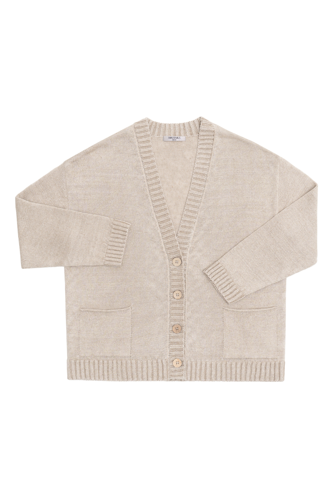 Knitted cardigan made of 100% linen. Loose fit model with dropped shoulders, long sleeves, patch pockets and V-neck. The edges of the product are ribbed. Button closure.