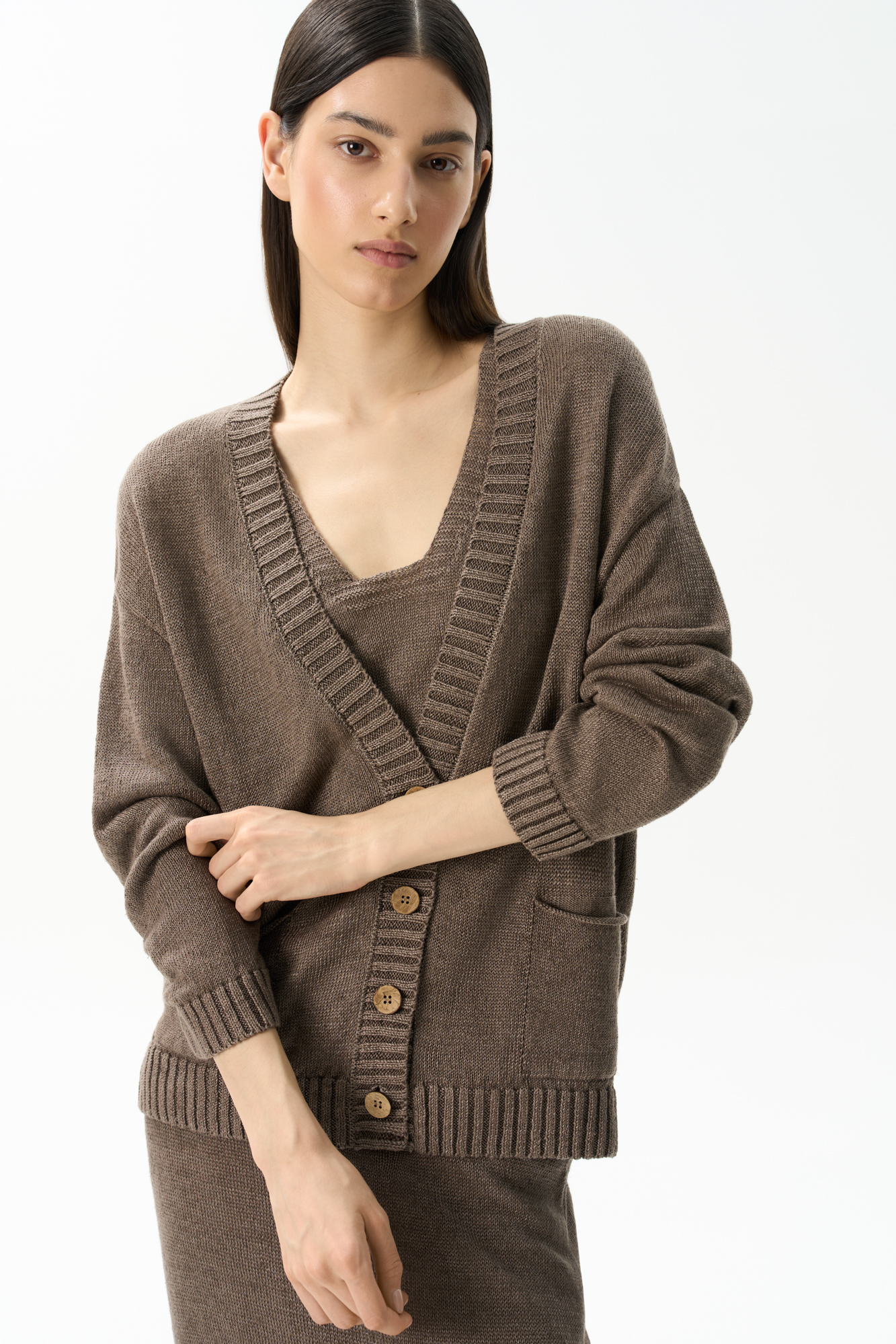 Knitted cardigan made of 100% linen. Loose fit model with dropped shoulders, long sleeves, patch pockets and V-neck. The edges of the product are ribbed. Button closure.