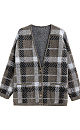 Knitted cardigan made of wool with the addition of mohair, made with a complex check pattern. Loose silhouette with two patch pockets, deep V-neck and button closure.