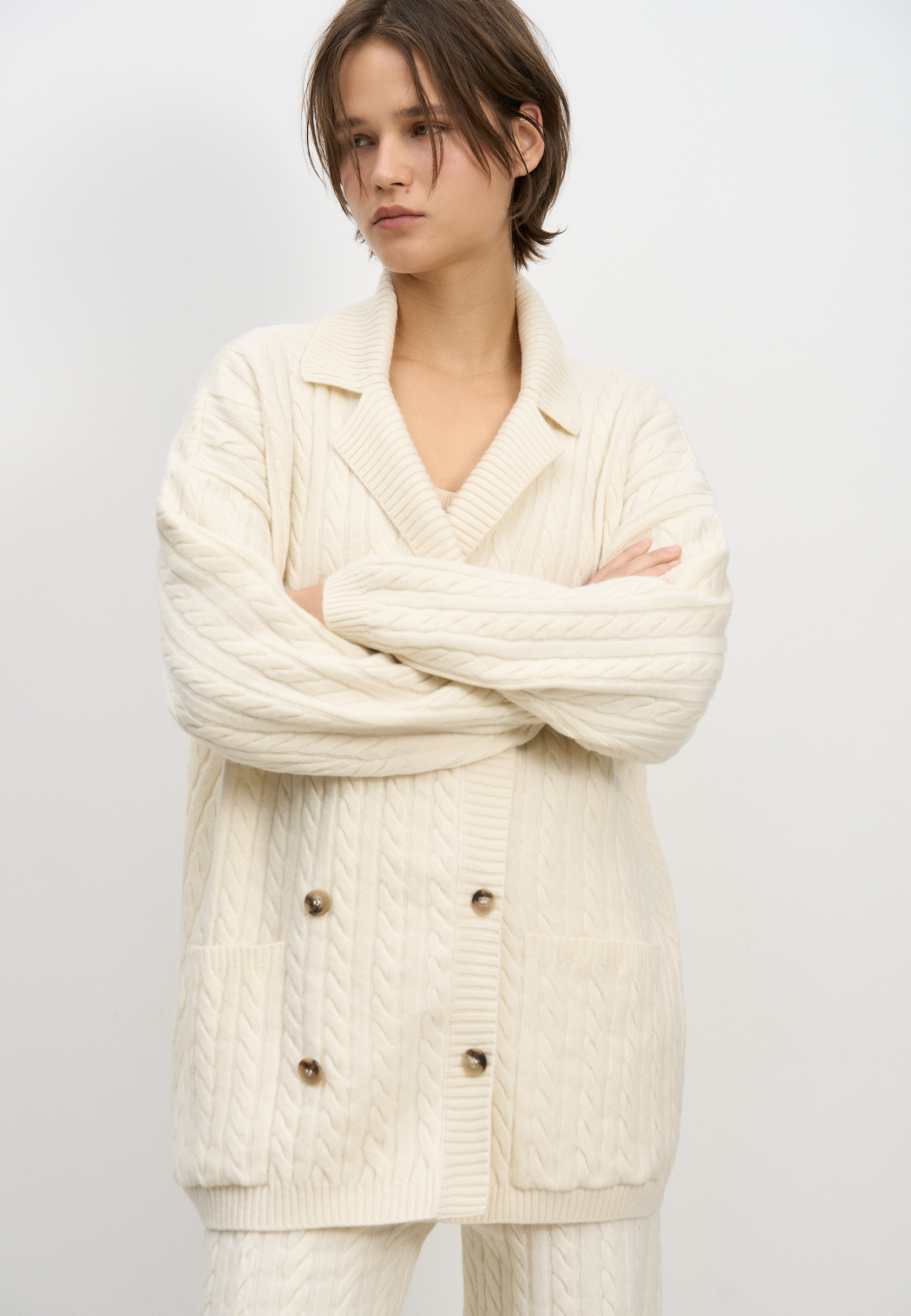 Knitted cardigan made of cashmere and wool. Model with turn-down collar and large patch pockets. The edges of the product are made with a wide rib.