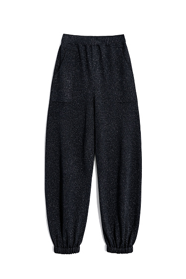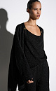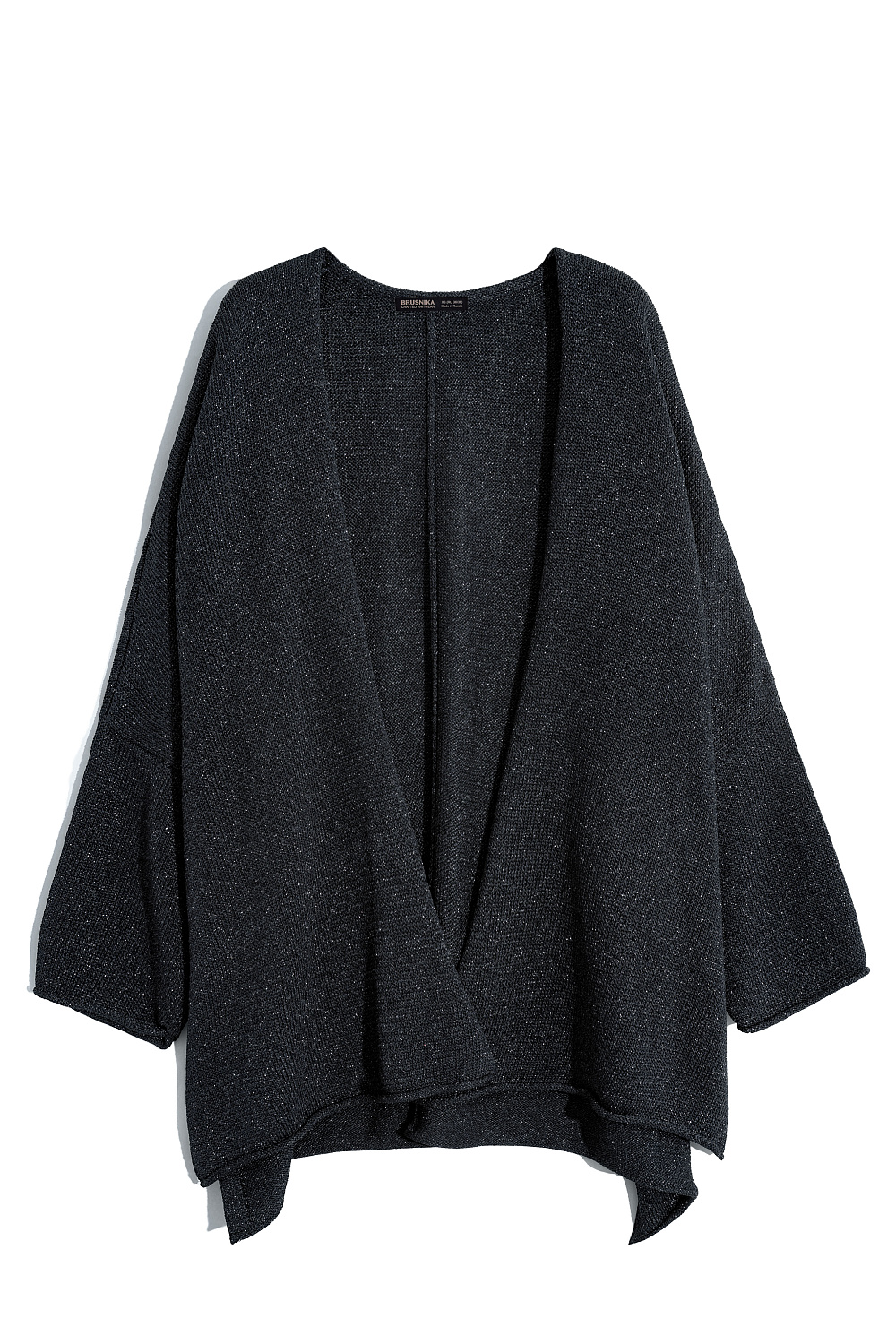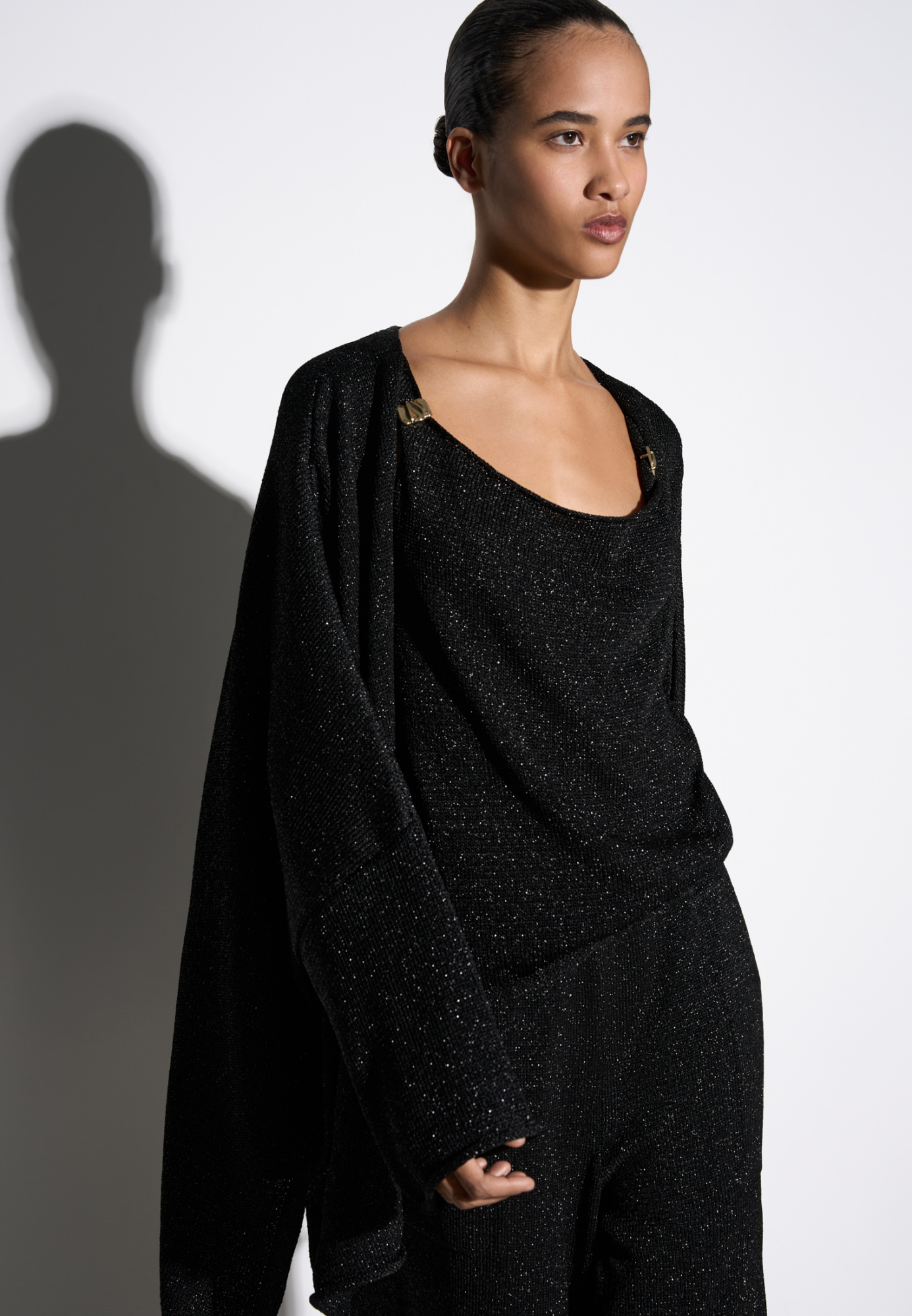 Knitted cardigan with lurex. The model has a loose fit, with long wide sleeves and dropped shoulders. No clasp.