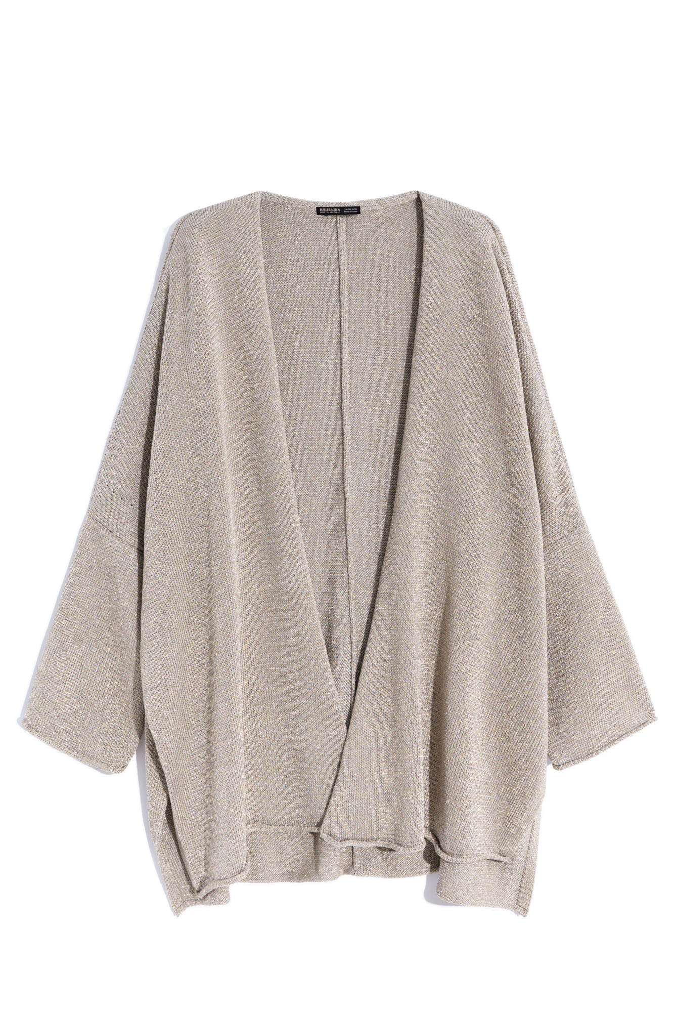 Knitted cardigan with lurex. The model has a loose fit, with long wide sleeves and dropped shoulders. No clasp.