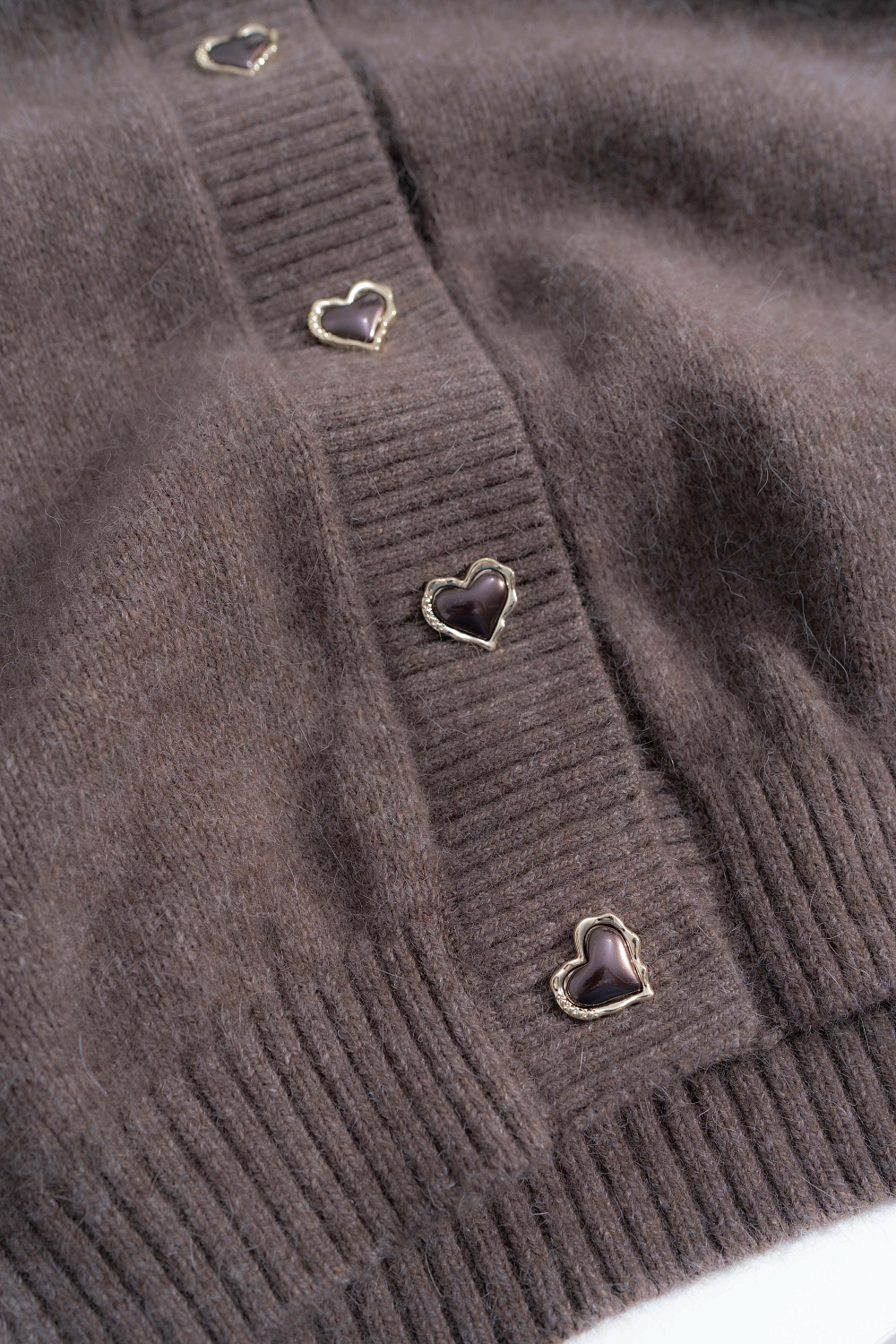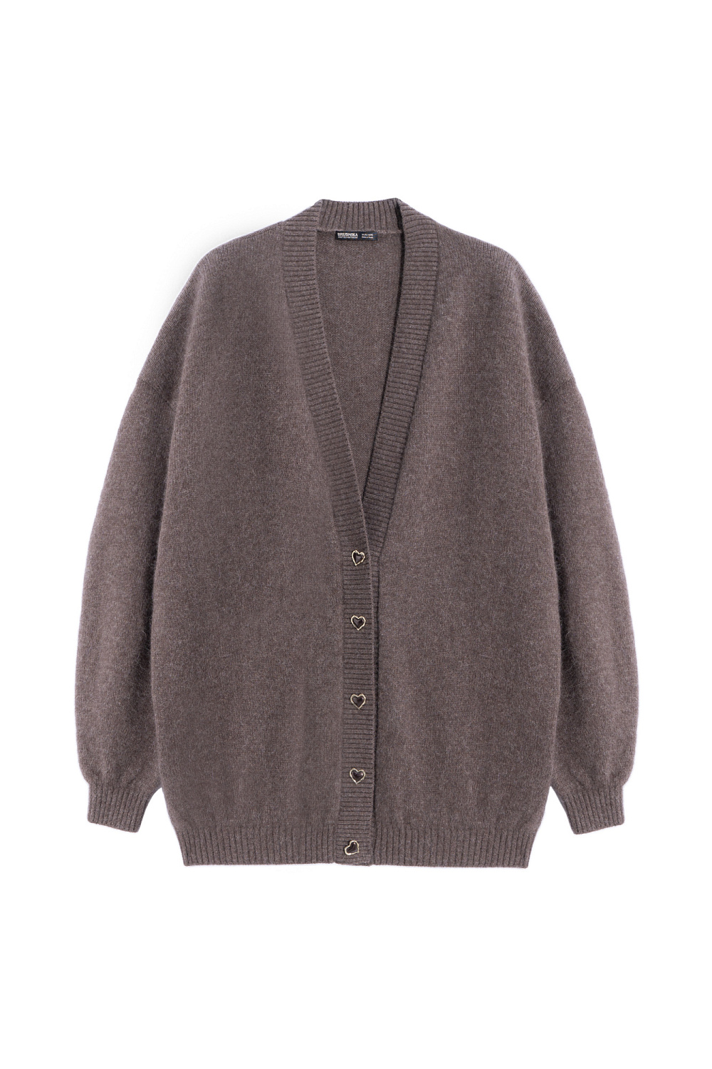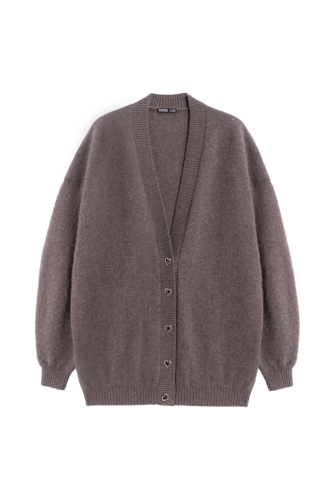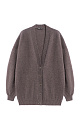 Knitted cardigan made of fox down. The model has a loose silhouette with dropped shoulders, wide sleeves and a V-neck. The product is decorated with accent pearl buttons. The edges are ribbed.