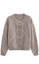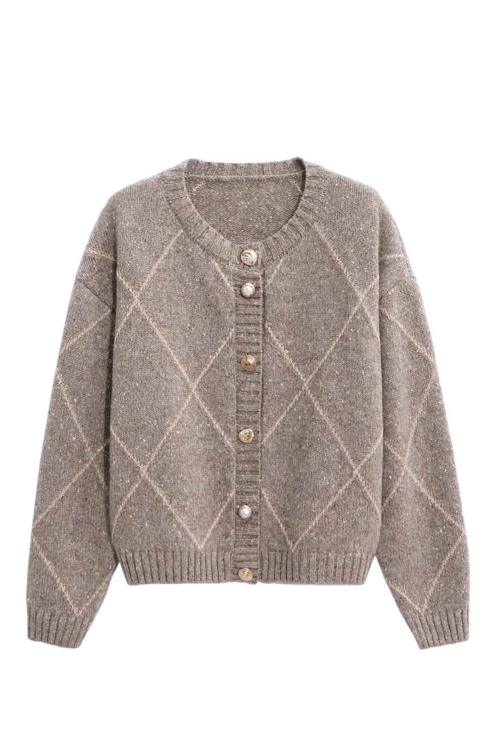 Knitted cardigan with argyle pattern made of yak wool with the addition of lurex. The model has a loose silhouette with dropped shoulders, a round neckline and a fastening with large buttons. The edges of the product are ribbed.