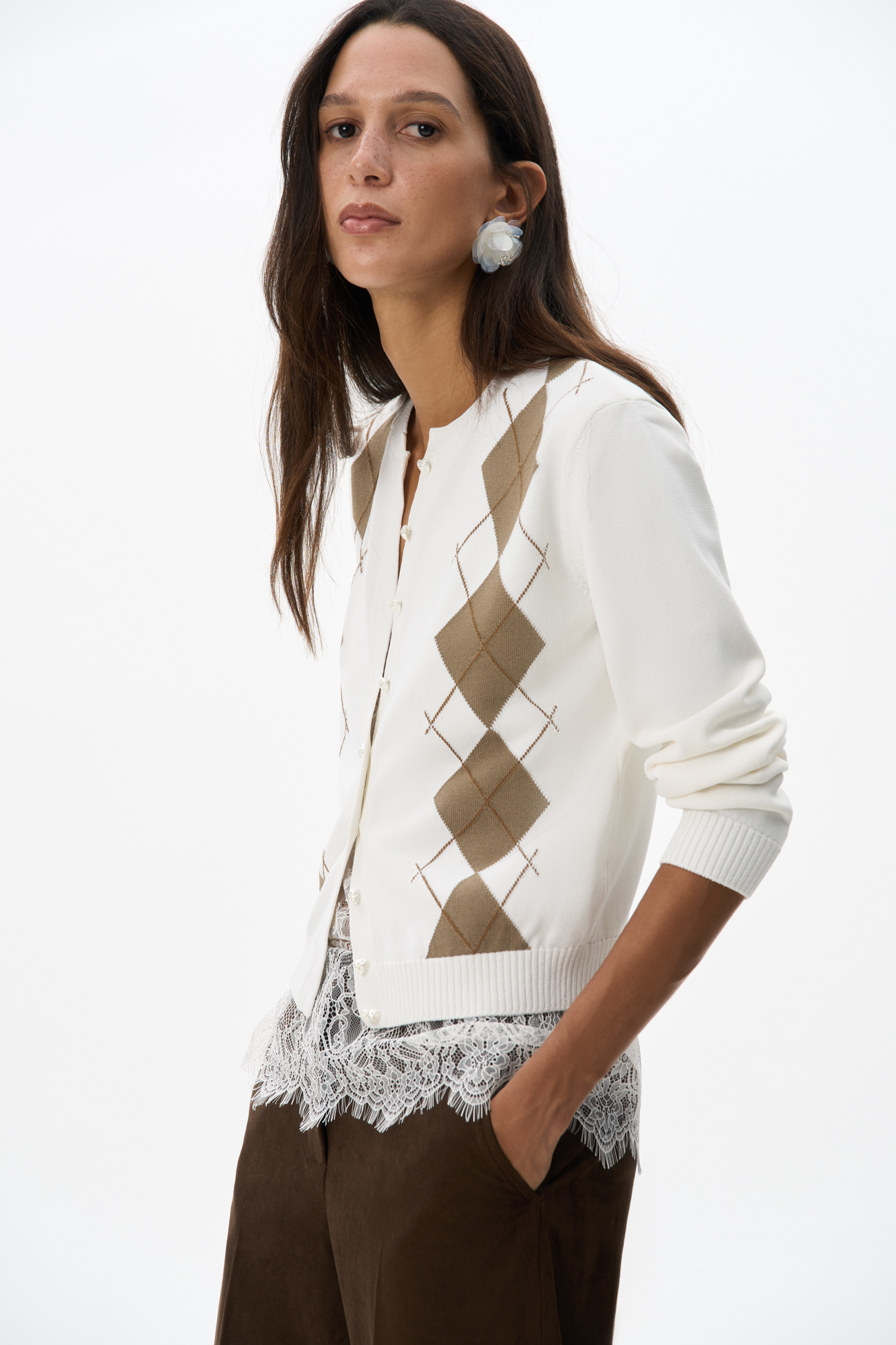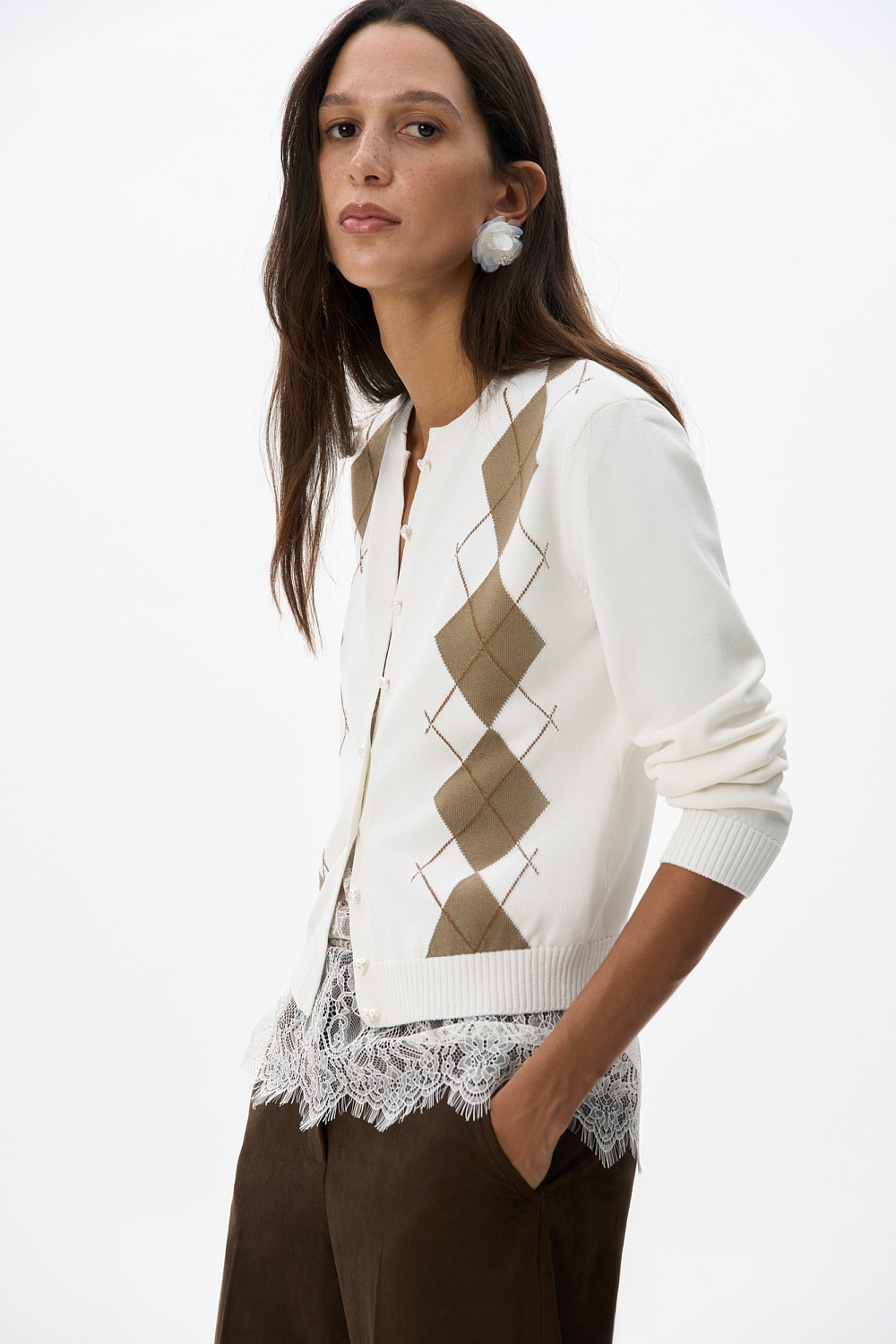 Knitted viscose cardigan with argyle pattern. Loose silhouette with long sleeves, round neckline and sweetheart button closure. The edges of the product are ribbed.
