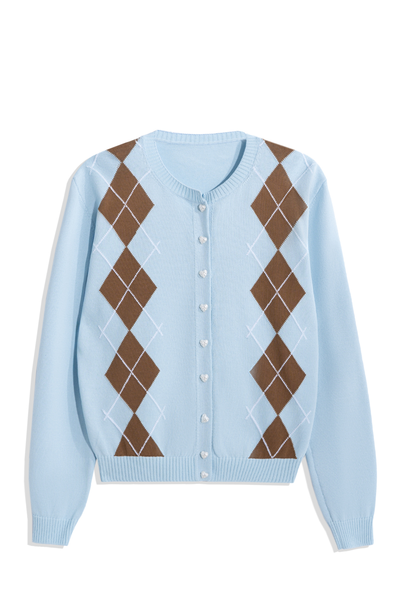 Knitted viscose cardigan with argyle pattern. Loose silhouette with long sleeves, round neckline and sweetheart button closure. The edges of the product are ribbed.