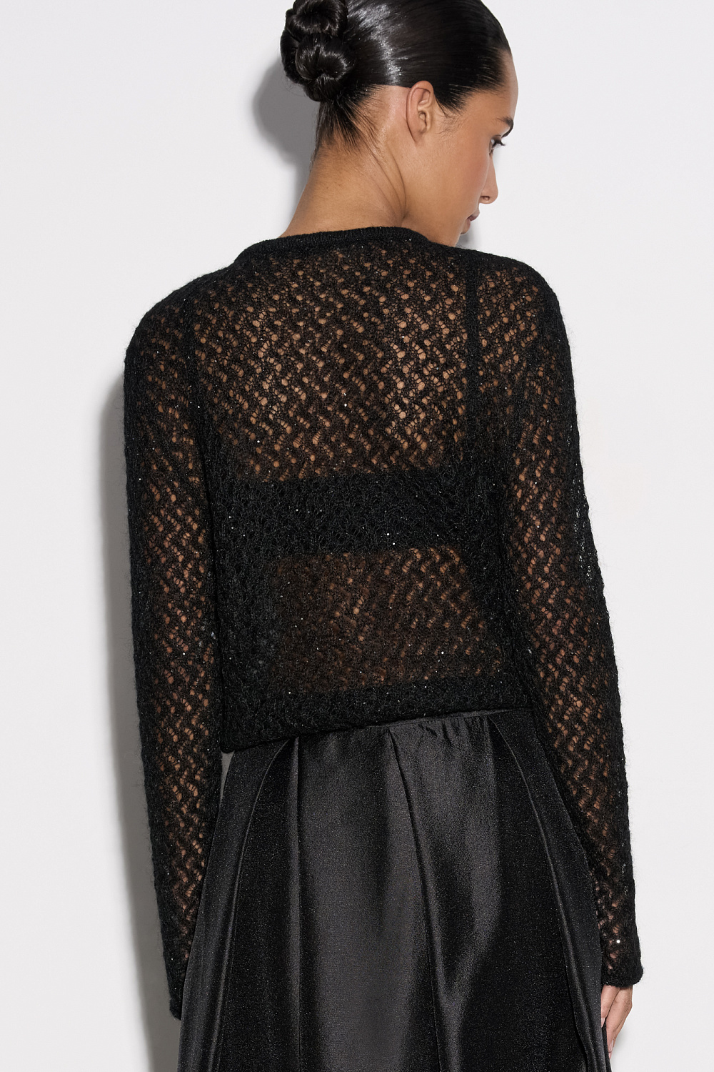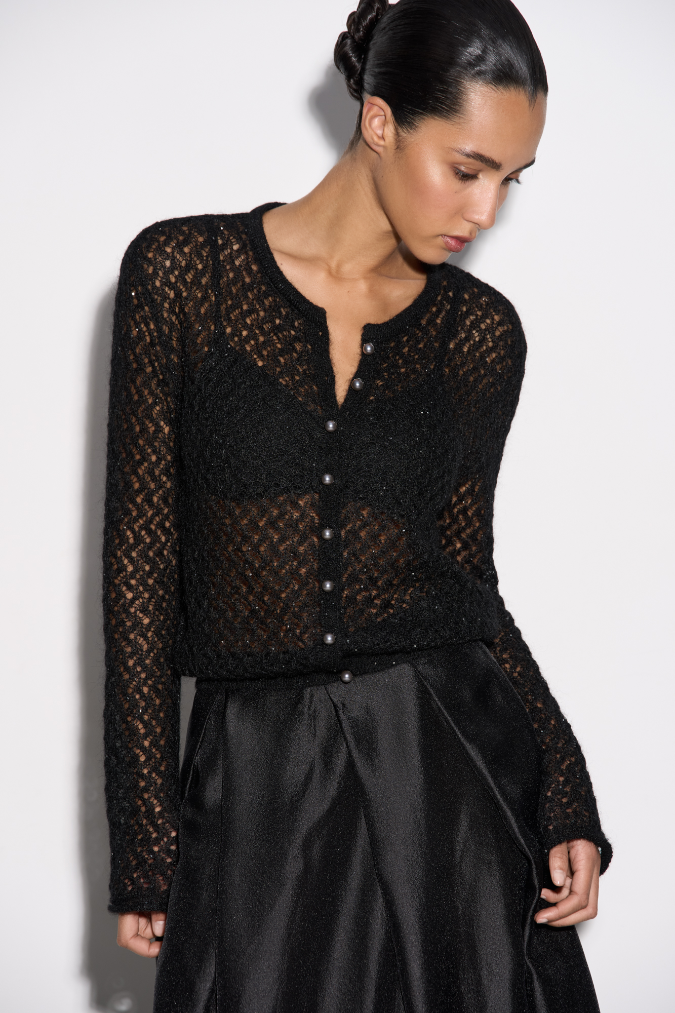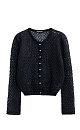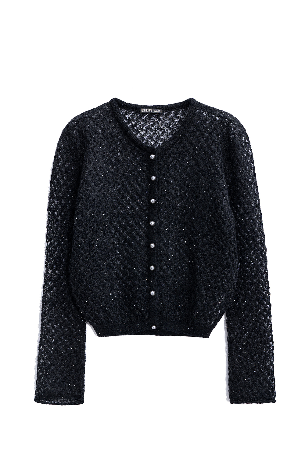 Knitted openwork cardigan made of kidmohair, decorated with small sequins. Loose silhouette with long sleeves, round neckline and pearl button closure.