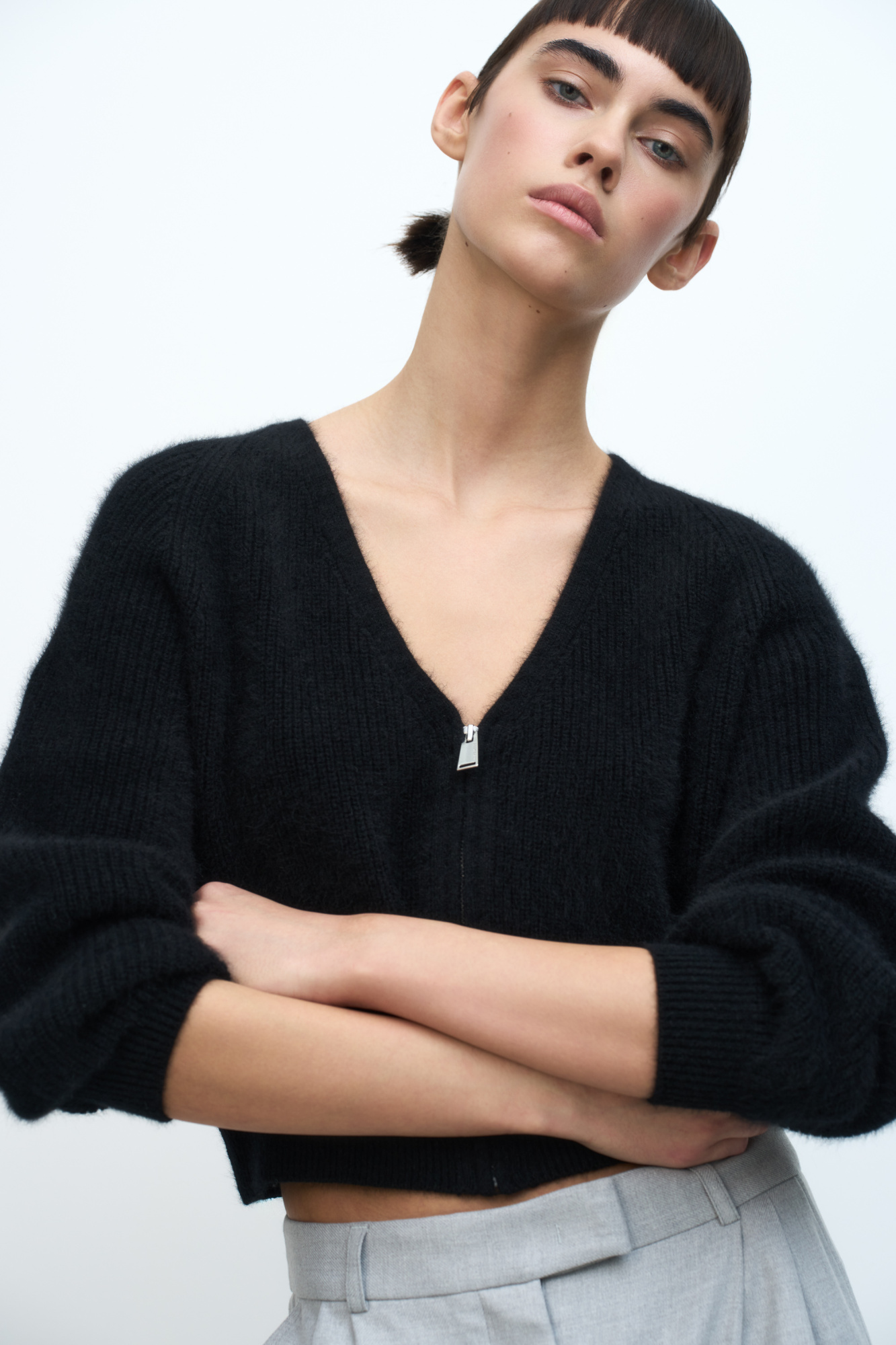 Zip-up cropped bomber jacket with V-neck. The yarn contains 40% natural fox down making the bomber jacket warm, soft and lightweight.