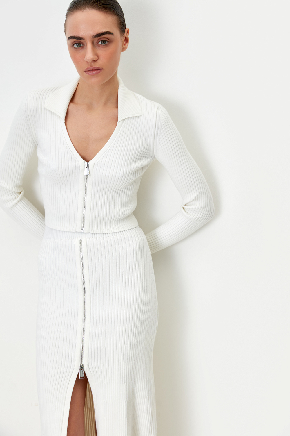 Cropped cardigan in viscose with added wool. Features stand-up collar and zip fastening.