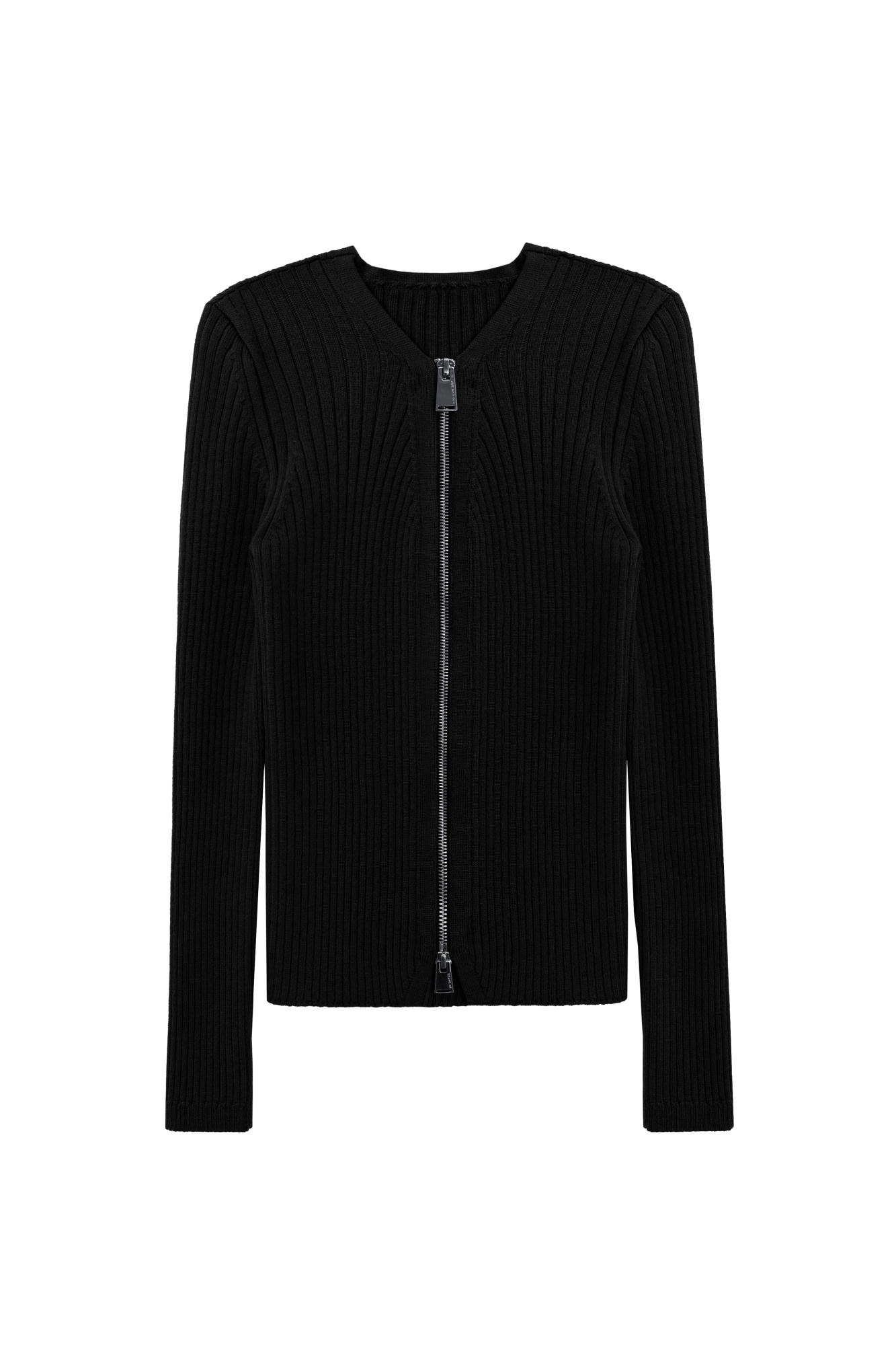Knitted cardigan with zipper. The model has a straight silhouette, long sleeves and a V-neck. The product is made with a wide rib.