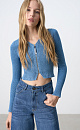Knitted cardigan made of cotton with added elastane. The model has a fitted silhouette, long sleeves and a V-neck. Zip closure. The item is decorated with rips and abrasions along the bottom edge. The color imitates boiled denim.