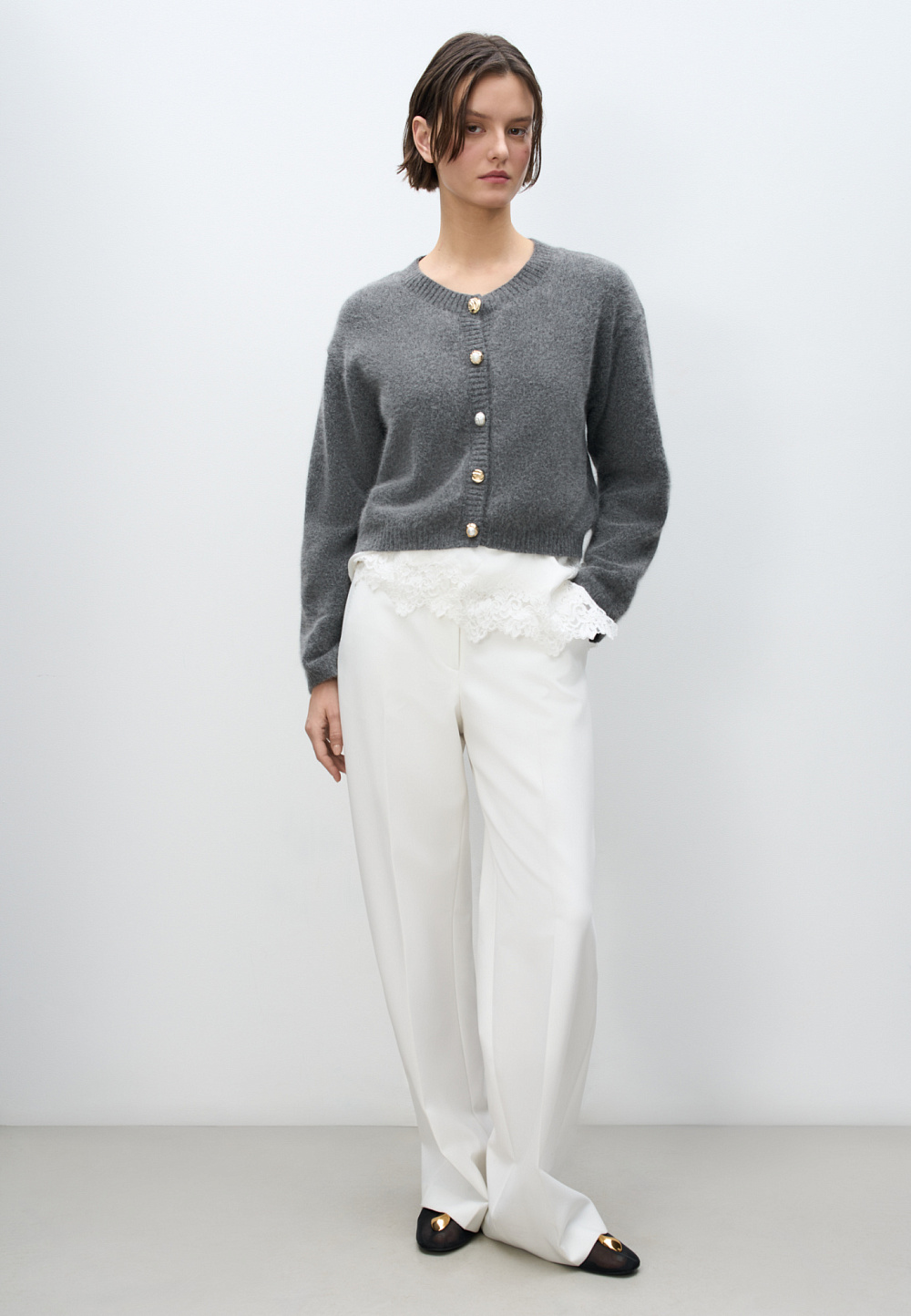 Knitted cardigan made of fox down. Loose silhouette model with dropped shoulders and a round neckline. The product is decorated with large accent buttons.