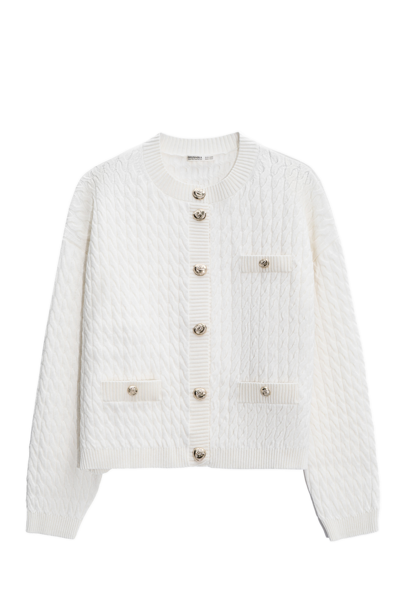 Cardigan made of 100% extrafine merino wool, made with knitted braids. Loose fit model with long sleeves, dropped shoulders and a round neckline. Imitation pockets with flaps. The product is decorated with large accent buttons.