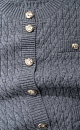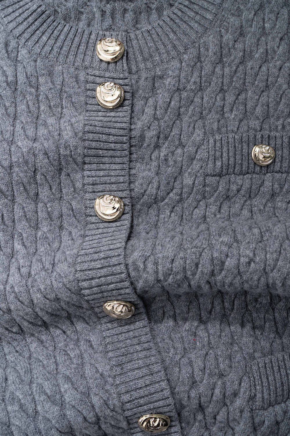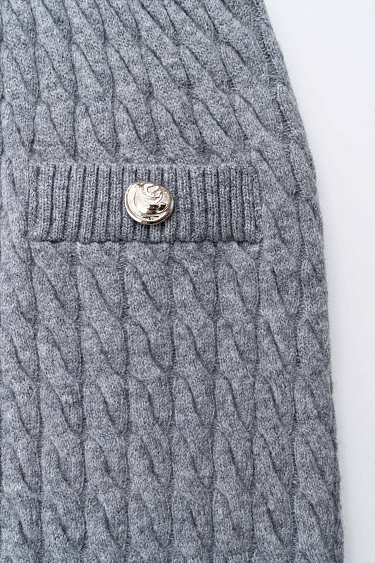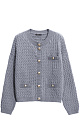 Cardigan made of 100% extrafine merino wool, made with knitted braids. Loose fit model with long sleeves, dropped shoulders and a round neckline. Imitation pockets with flaps. The product is decorated with large accent buttons.