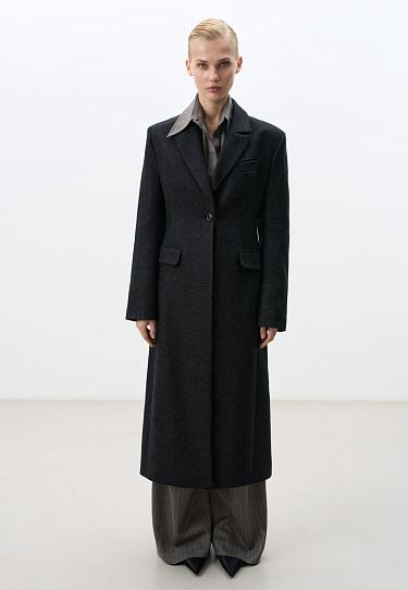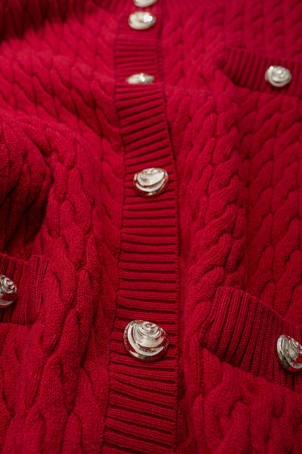 Cardigan made of 100% extrafine merino wool, made with knitted braids. Loose fit model with long sleeves, dropped shoulders and a round neckline. Imitation pockets with flaps. The product is decorated with large accent buttons.