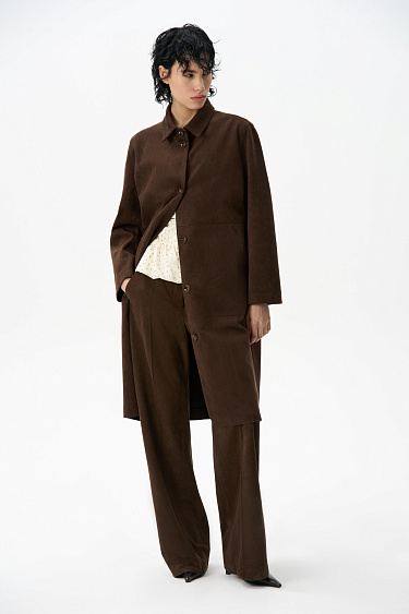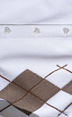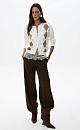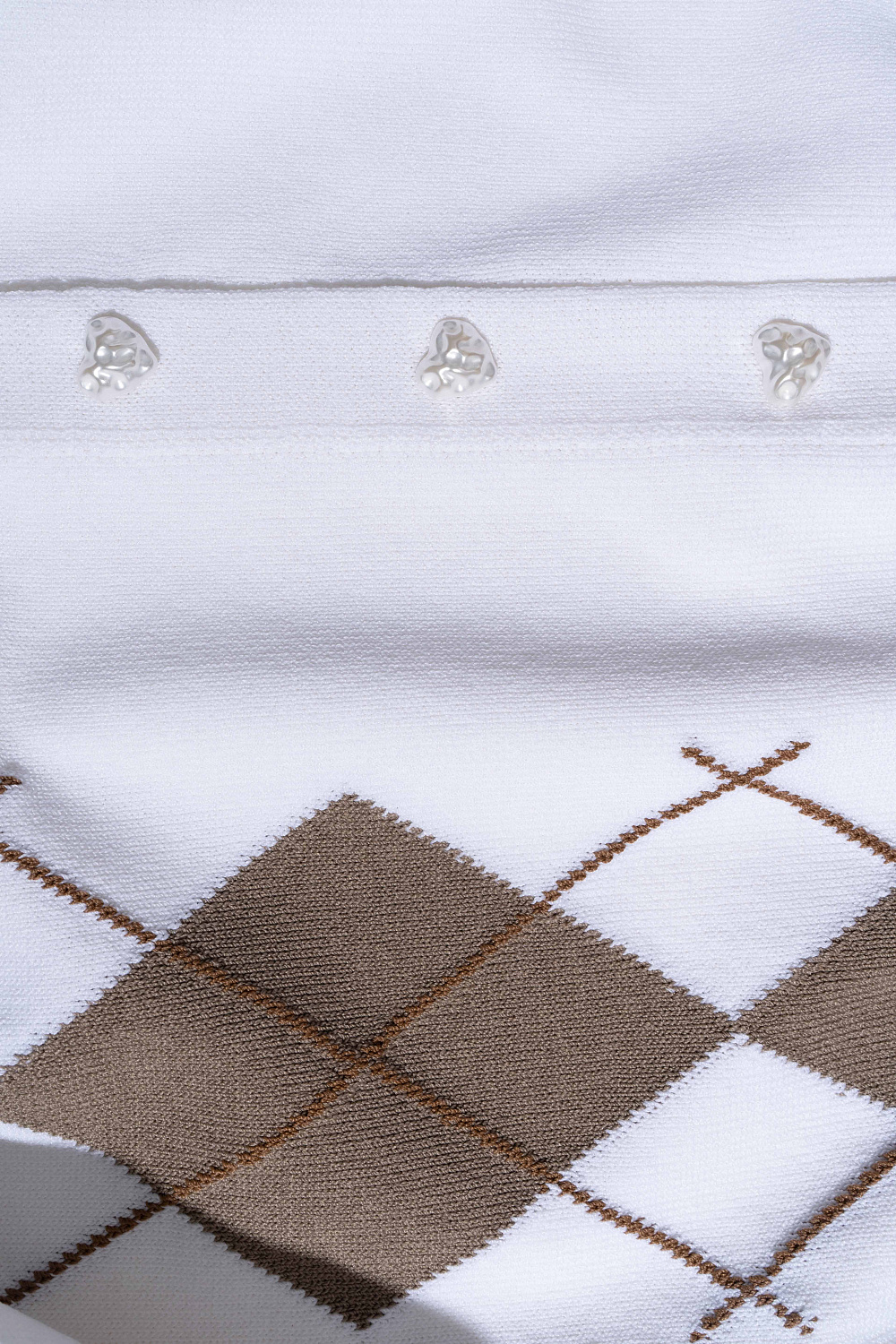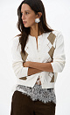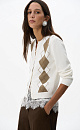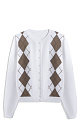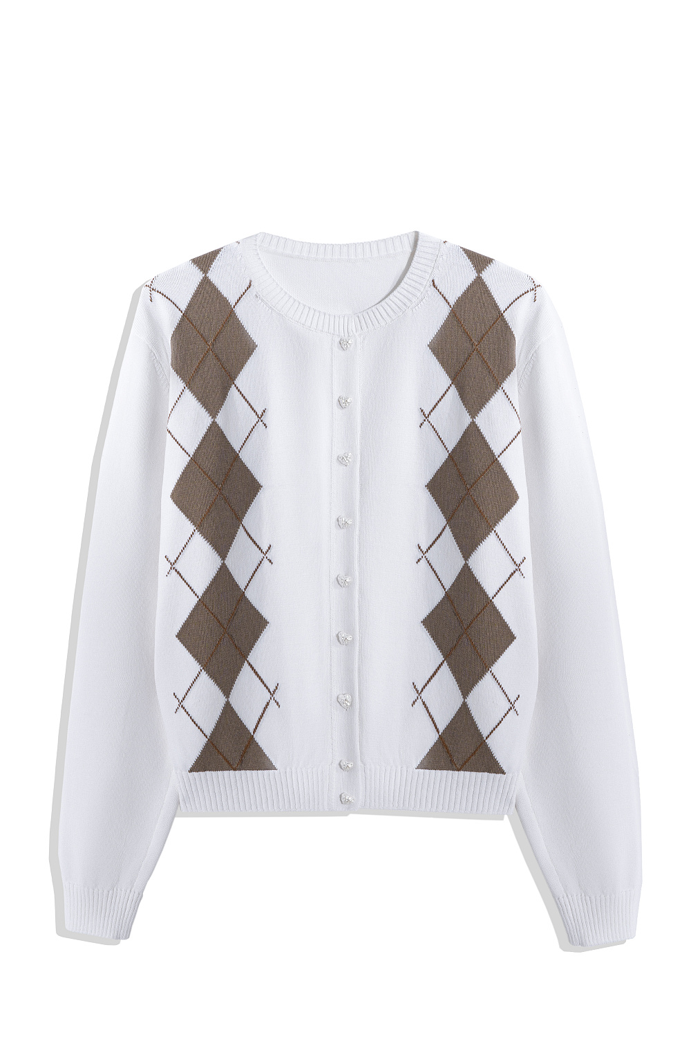 Knitted viscose cardigan with argyle pattern. Loose silhouette with long sleeves, round neckline and sweetheart button closure. The edges of the product are ribbed.