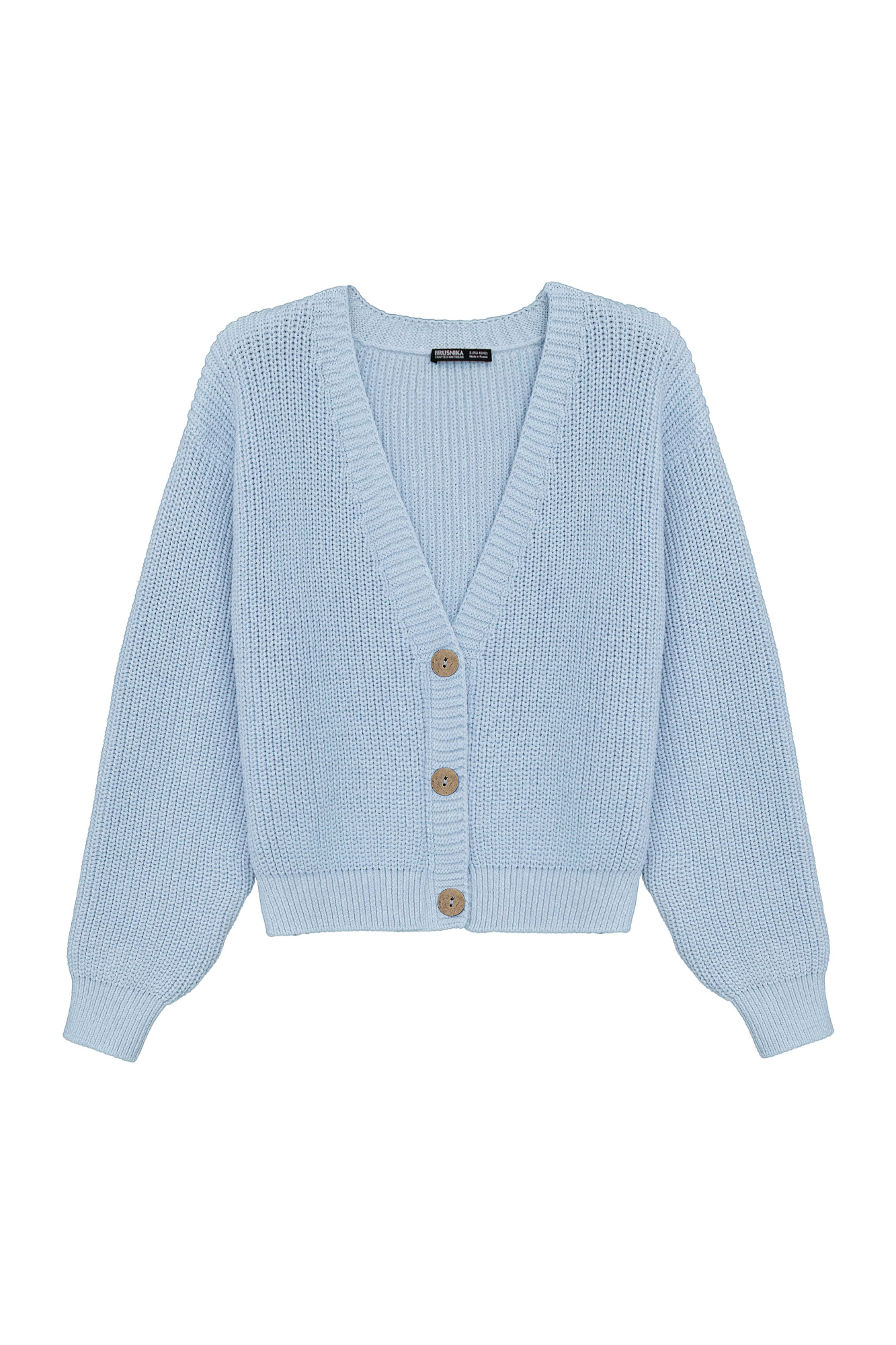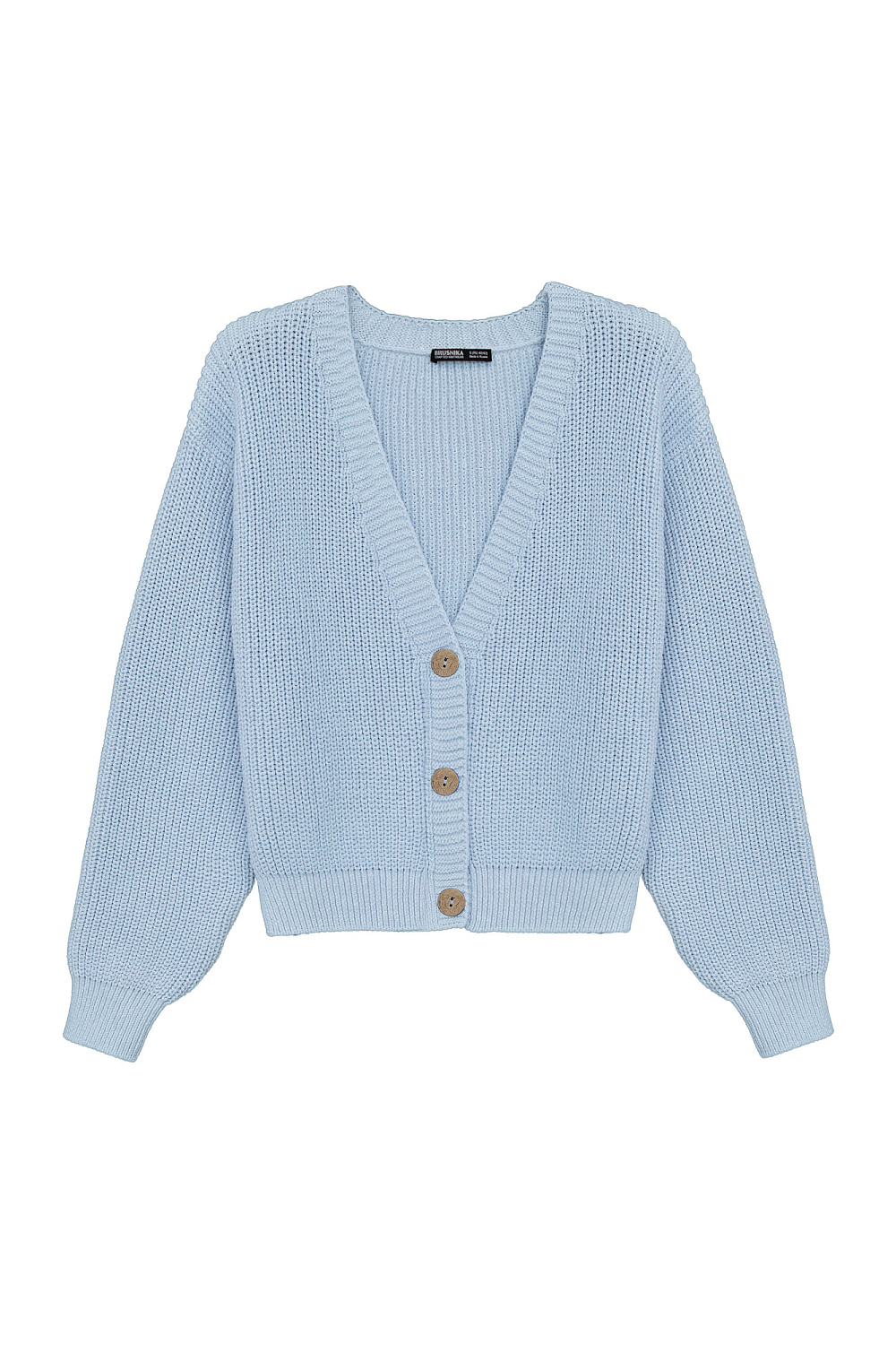 Cotton cardigan with long sleeves. V-neck, ribbed hem and cuffs.