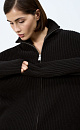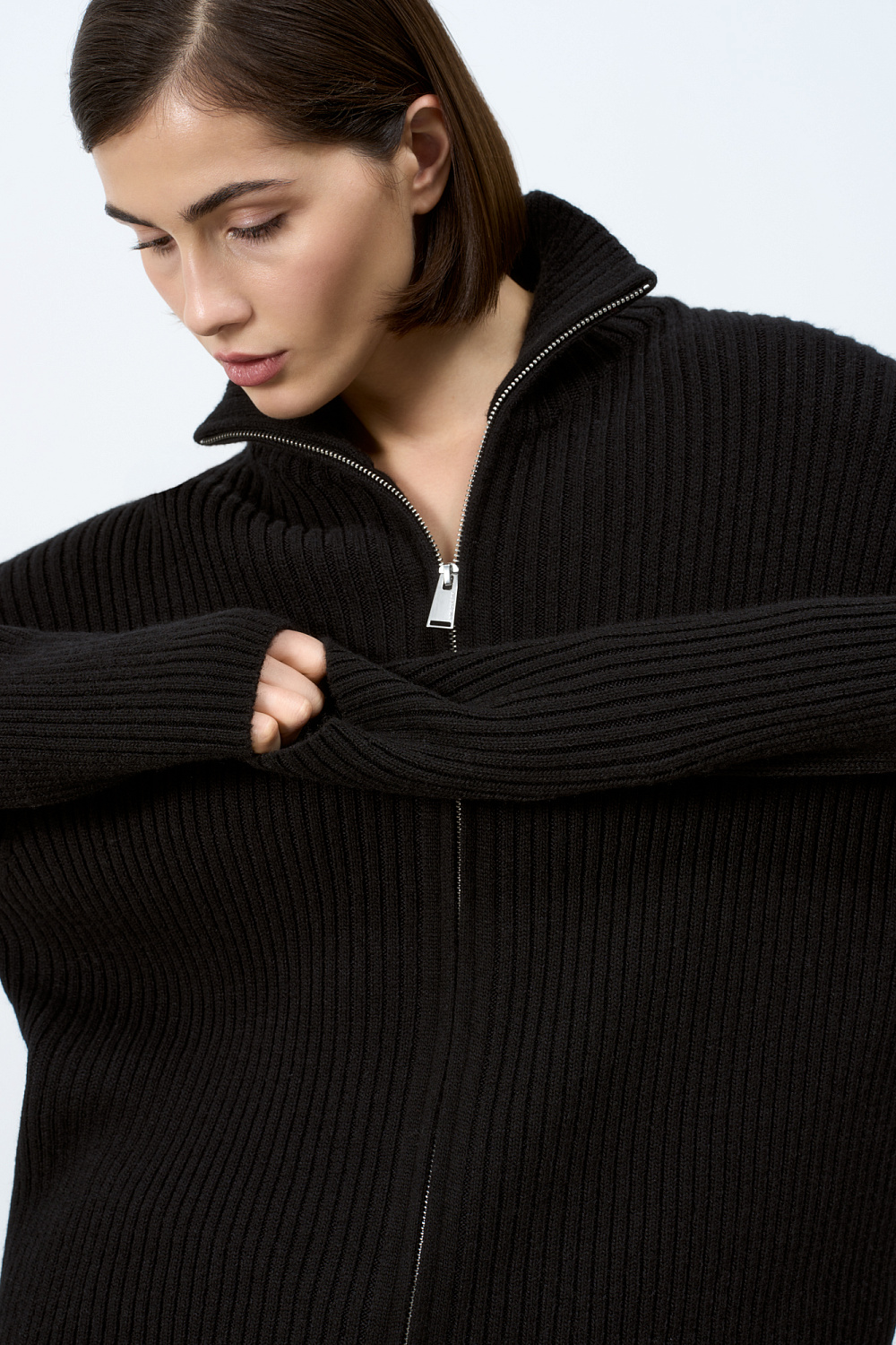 Knitted cardigan with a high stand-up collar, long sleeves and zip closure. For production, fine wool was used with the addition of delicate cashmere.